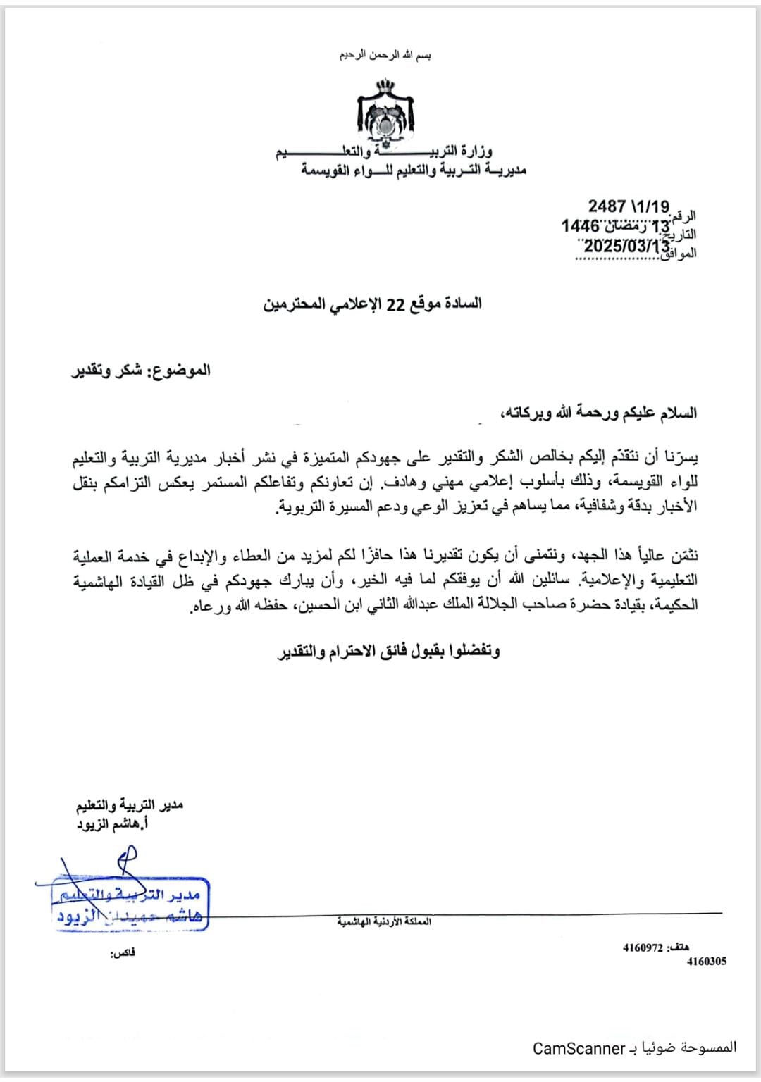 22 الاعلامي - تلقى موقع 22 الاعلامي كتاب شكر من مدير التربية والتعليم للواء القويسمة على الجهود التي يبذلها كادر الموقع في نشر اخبار ونشاطات المديرية.