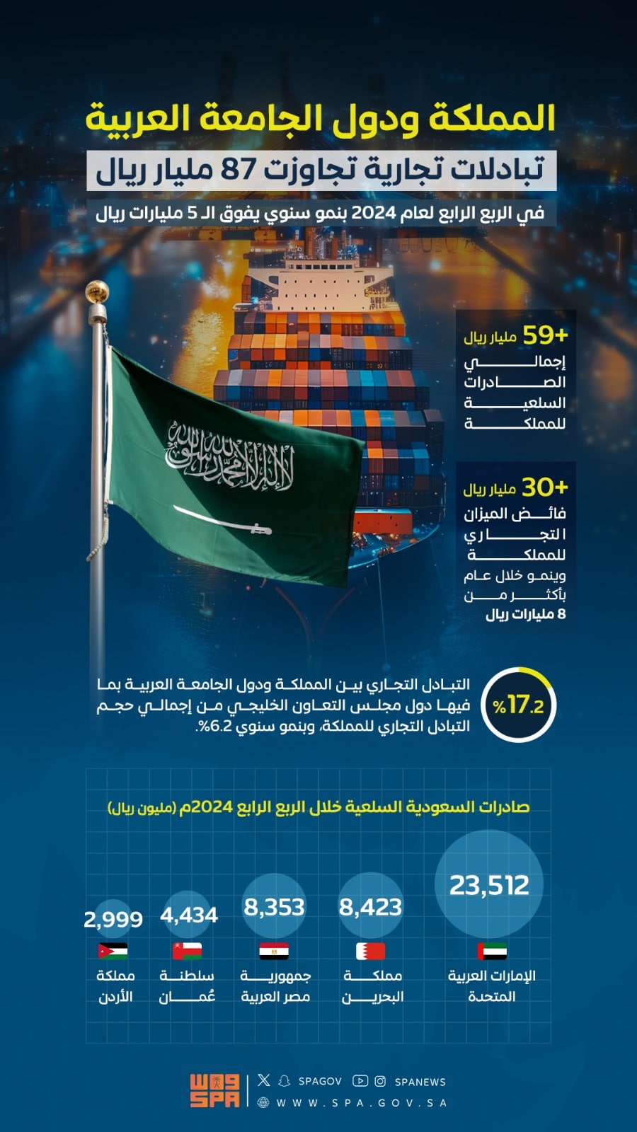 وفي إطار مسيرة النمو الاقتصادي الذي تشهده المملكة، سجل إجمالي أحجام التبادلات التجارية بين السعودية ودول الجامعة العربية بما فيها دول مجلس التعاون الخليجي نحو 87.768 مليار ريال سعودي ( الريال السعودي يساوي 0.27 دولار) خلال الربع الرابع من العام الماضي 2024.