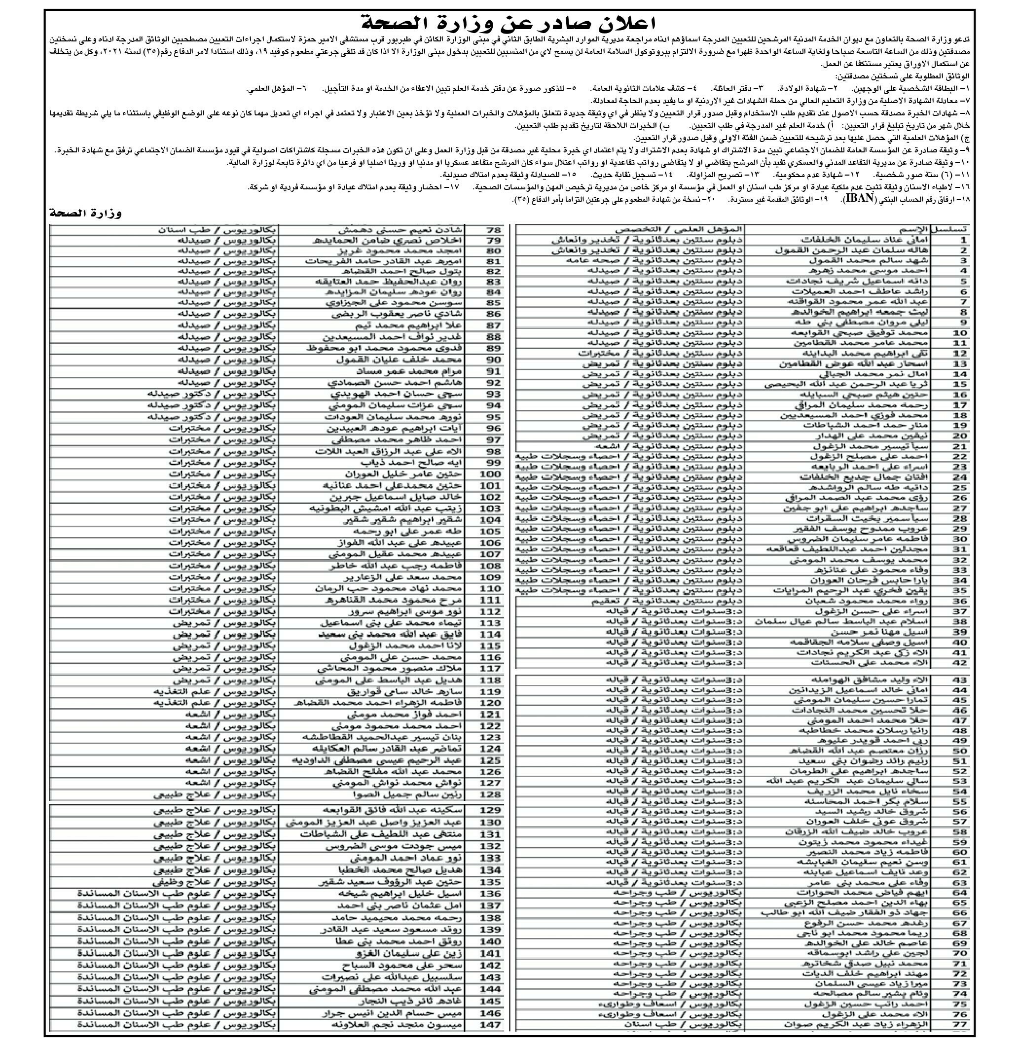 دعت وزارة الصحة بالتعاون مع ديوان الخدمة المدنية 147 مرشحا، لاستكمال إجراءات التعيين.