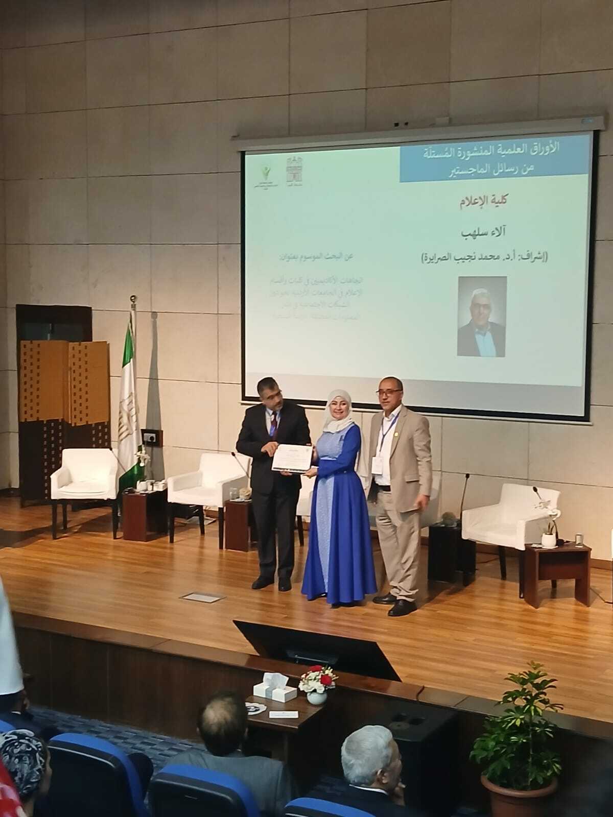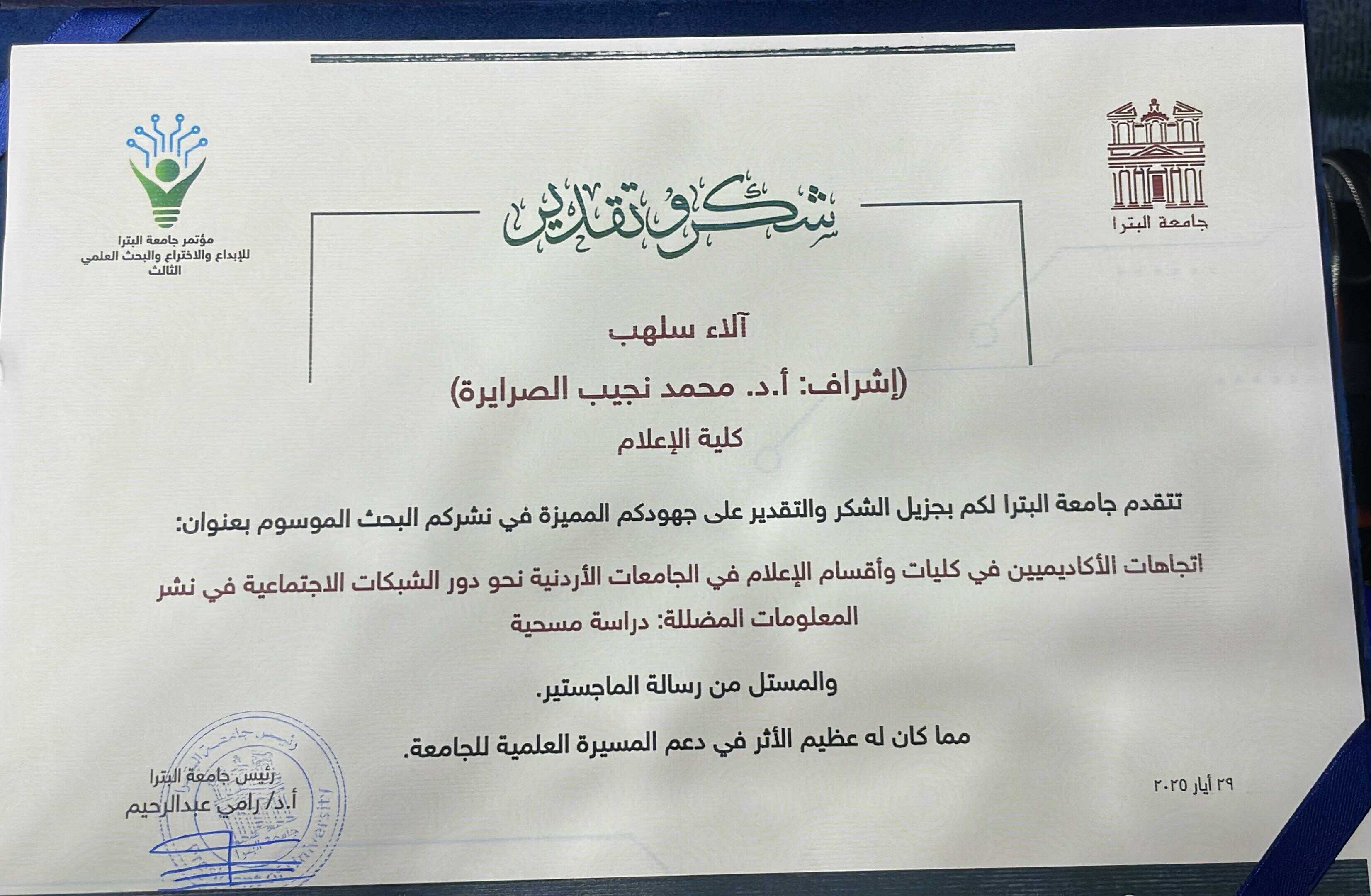 وجاء تكريم سلهب تقديراً لمشاركتها العلمية المتميزة، من خلال بحثها المنشور في مجلة دراسات التابعة للجامعة الأردنية والمستخرج من رسالة الماجستير بعنوان: "دور الشبكات الاجتماعية في نشر المعلومات المضللة: دراسة مسحية”، والذي أُنجز تحت إشراف الأستاذ الدكتور محمد نجيب الصرايرة نظراً لأهمية البحث العلمية وارتباطه المباشر بقضايا التضليل الإعلامي في البيئة الرقمية.