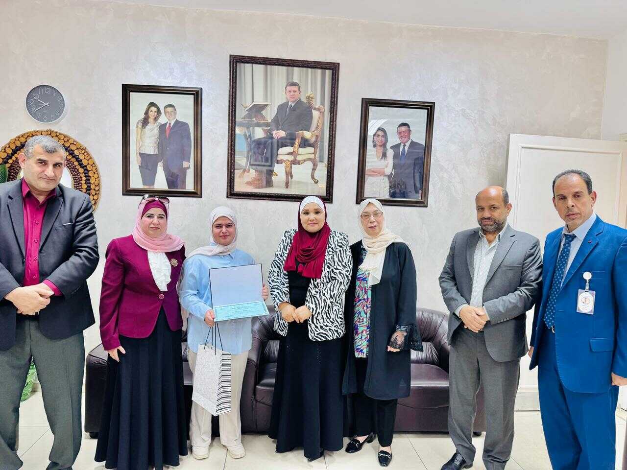 وتم التكريم بحضور مدير الشؤون الإدارية والمالية الأستاذ أيمن النصيرات، ومديرة المدرسة الآنسة رائدة بطيحة ، ورئيس قسم الاشراف التربوي الدكتور مالك خصاونة، ومشرف التربية الفنية الأستاذ أحمد جرادات.