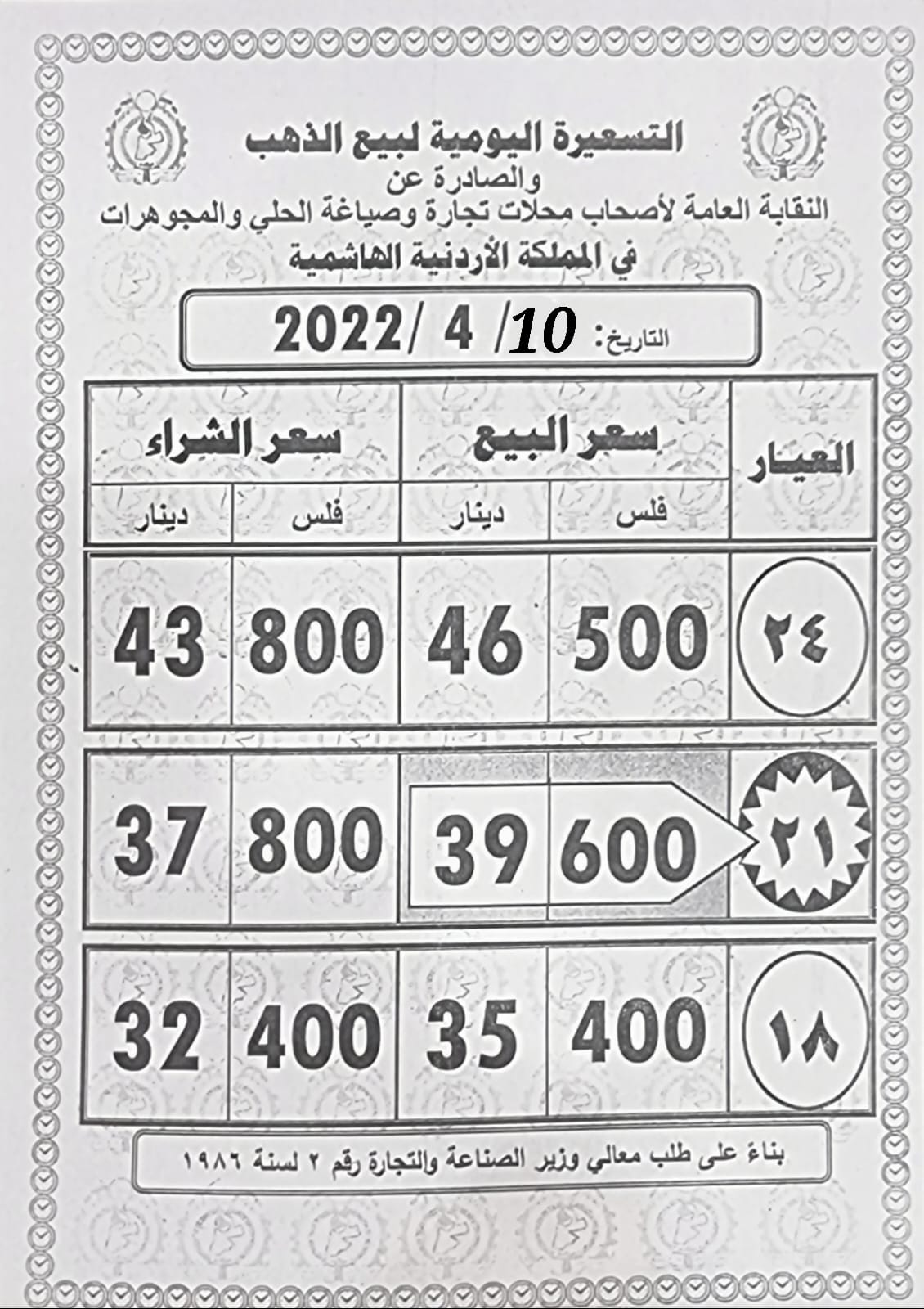 التسعيرة اليومية لبيع الذهب، والصادر عن النقابة العامة لأصحاب محلات تجارة وصياغة الحلي والمجوهرات ليوم الأحد 10/4/2022 في المملكة الأردنية الهاشمية.
