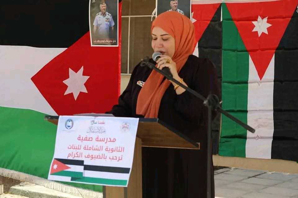 مديرة المدرسة المستضيفة فيروز الشواشرة، استهلت الحفل بكلمة رحبت من خلالها بالحضور معربًةً عن سعادتها باستضافة مدرستها هذه الفعالية الخاصة و الغالية على قلب كل الاردنيون والتي تعكس عمق الانتماء والولاء للوطن والقيادة الهاشمية.