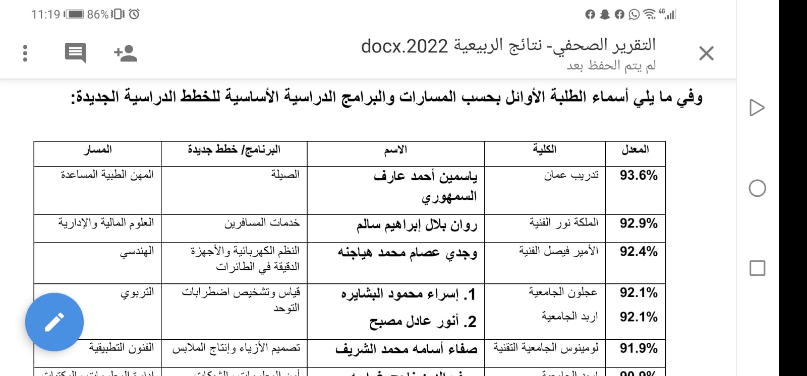 يسرني أن ألتقي بكم جميعاً في هذا الصباح لنعلن لكم نتائج امتحان الشهادة الجامعية المتوسطة (الشامل) في دورته الربيعية لعام 2022 بعد توقف عن عقد هذه الدورة استمر لسنتين بسبب جائحة كورونا، وقد حرصت الجامعة على اتخاذ كافة الإجراءات الممكنة لمساعدة الطلبة وتمكينهم من تحقيق متطلبات النجاح في الامتحان، خاصة وأن الدراسة كانت في معظمها في السنتين الأخيرتين عن بعد.