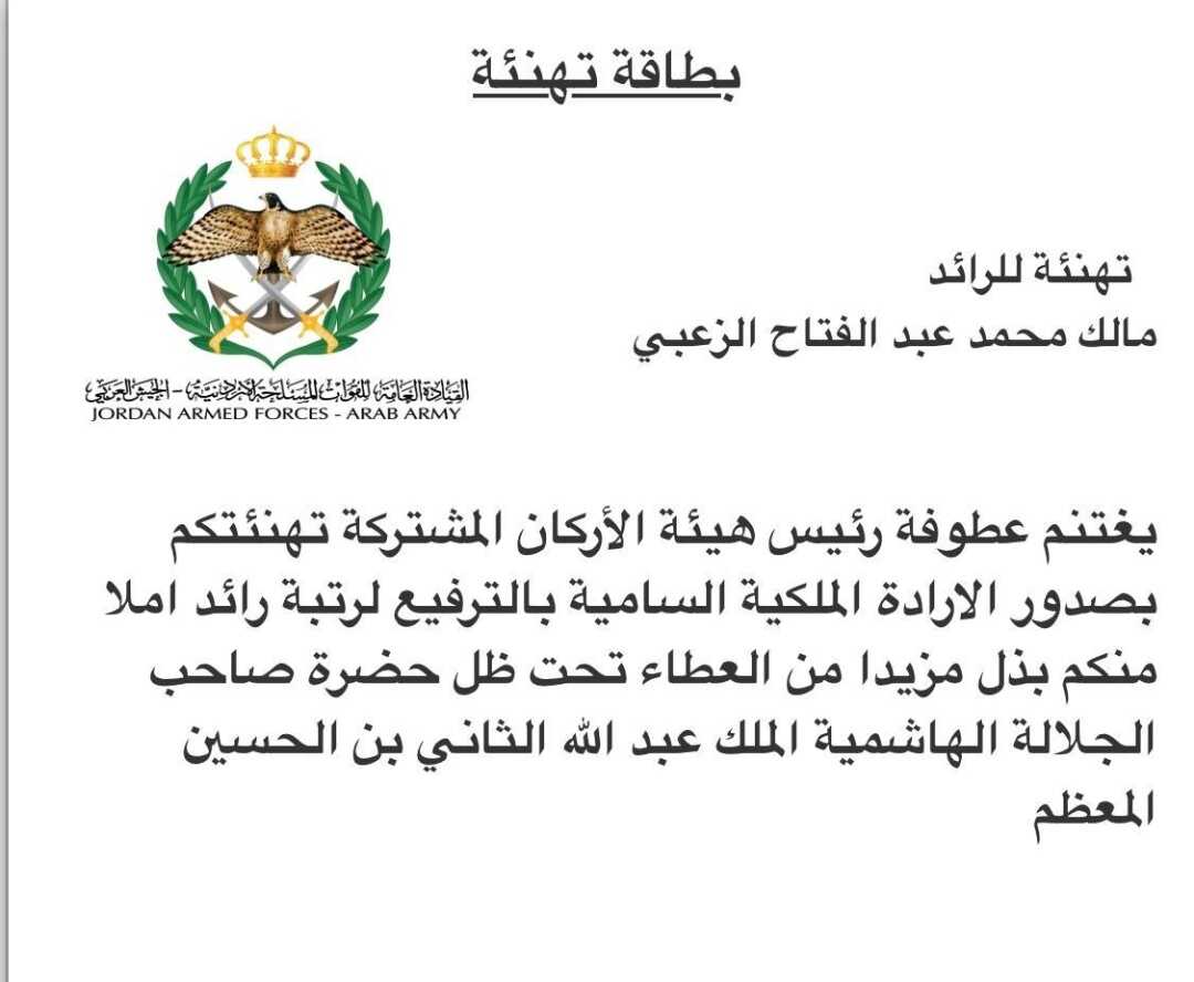 ابارك بكل ما تحمله عبارات التهنئة من معاني وبكل ما تسمو به الأنفس من عبارات المباركة بمناسبة صدور قرار ترفيع ابني الغالي الرائد الطيار مالك الزعبي في سلاح الجو الملكي، تحت ظل الراية الهاشمية المظفرة بقيادة جلالة الملك عبدالله الثاني ابن الحسين المعظم، حفظه الله وأعز ملكه.