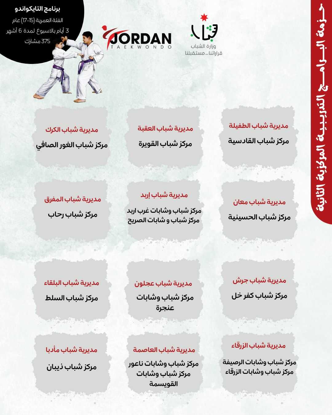كما تتضمن الحزمة تنفيذ دورة تدريبية في رياضة التايكواندوا بالشراكة مع الاتحاد الأردني للتايكواندوا، والتي تأتي في إطار سعي الوزارة لتعزيز النشاط الرياضي والبدني لدى الشباب وتنمية مهاراتهم في فنون الدفاع عن النفس، وهو بمجمله ما يتناسب مع محور الشباب والصحة والنشاط البدني في الاستراتيجية الوطنية للشباب.