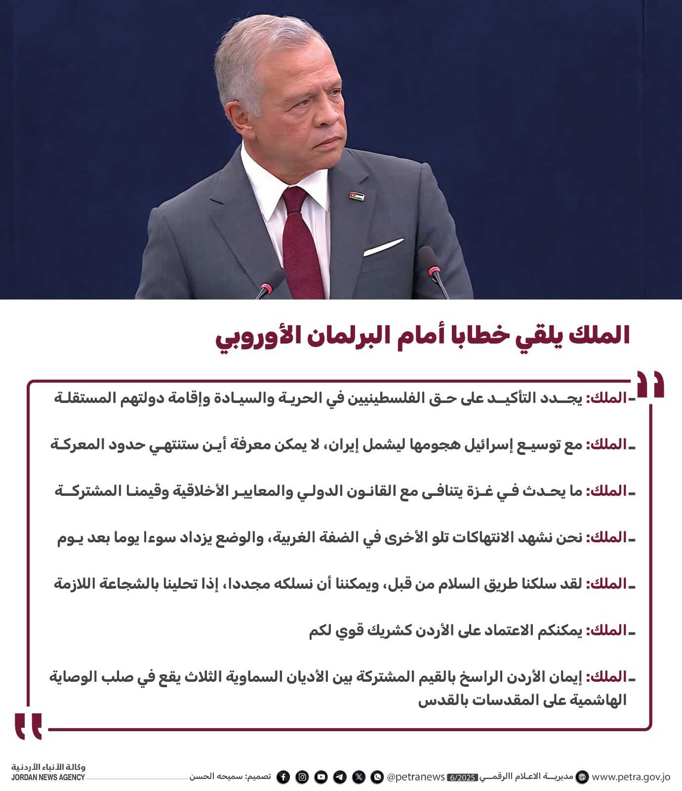 ولفت جلالته إلى أنه مع توسيع إسرائيل هجومها ليشمل إيران، أصبح من غير الممكن معرفة أين ستنتهي حدود هذه المعركة، الأمر الذي يهدد الشعوب في كل مكان.