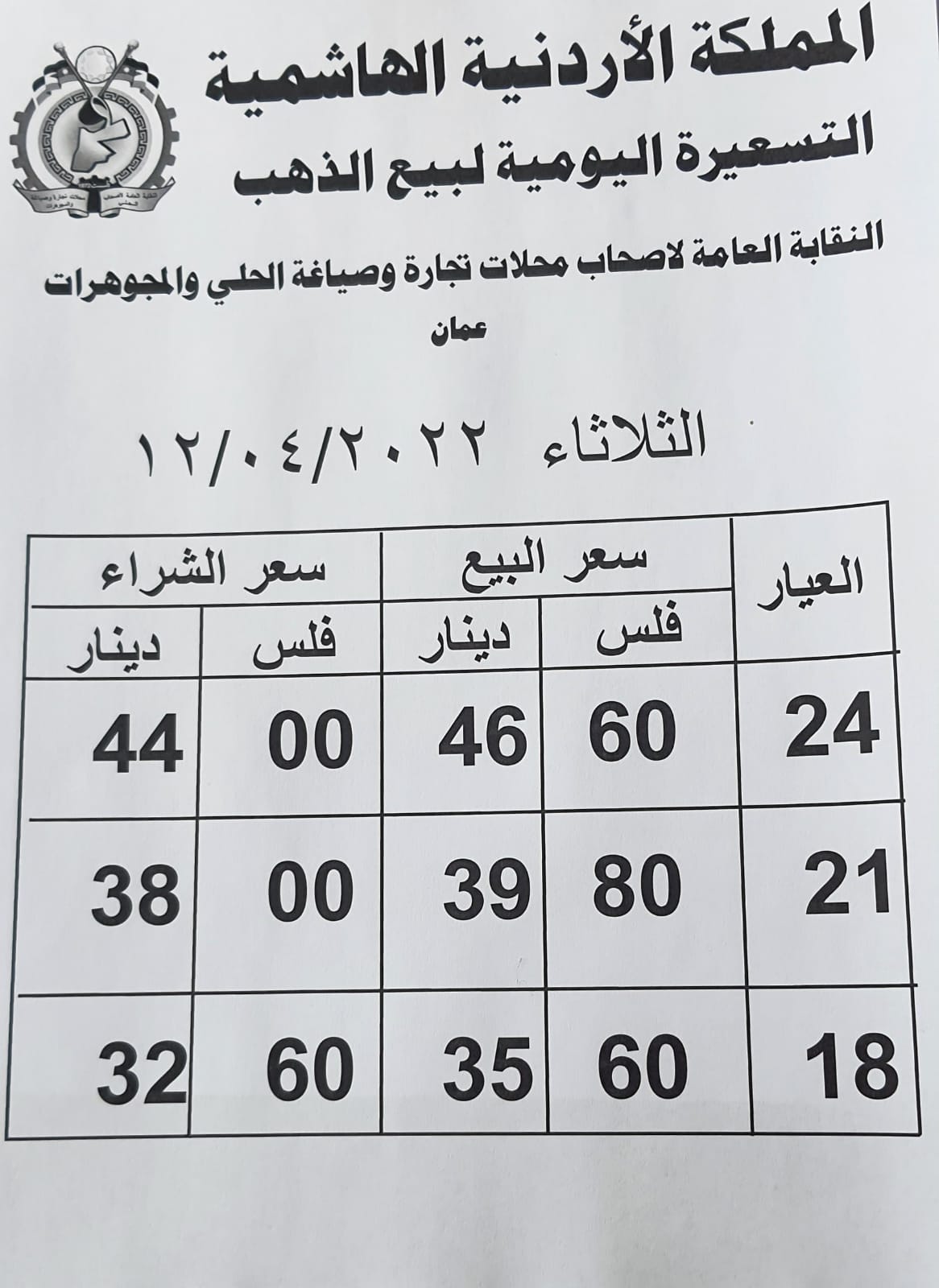 نشرة التسعيرة اليومية لبيع الذهب ليوم الثلاثاء 12/4/2022 ، الصادرة عن النقابة العامة لأصحاب محلات تجارة وصياغة الحلي والمجوهرات.