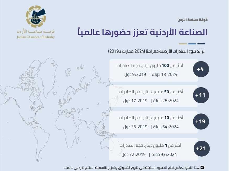 وحسب البيانات التي حصلت عليها وكالة الأنباء الأردنية (بترا)، توسعت خارطة الأسواق التصديرية لتشمل عددا أكبر من الدول وبقيم متصاعدة، ما يعكس تحسنا في التنافسية والقدرة على الوصول للأسواق العالمية.