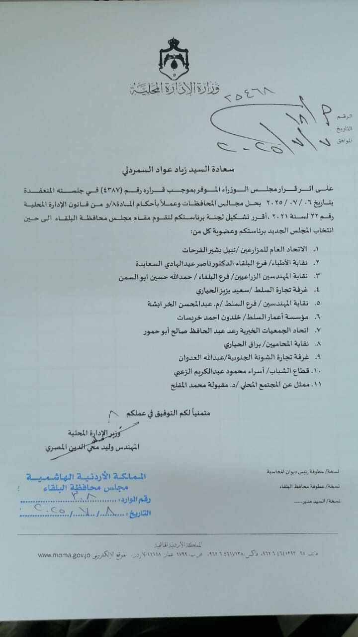 22 الاعلامي - قرر وزير الإدارة المحلية المهندس وليد المصري تعيين السيد زياد عواد السمردلي رئيساً للجنة المؤقتة المكلفة بإدارة شؤون مجلس محافظة البلقاء، وذلك بموجب قرار مجلس الوزراء رقم (4287) الصادر في جلسته المنعقدة بتاريخ 7 تموز 2025، والقاضي بحل مجالس المحافظات استناداً لأحكام المادة (6/هـ) من قانون الإدارة المحلية رقم 22 لسنة 2021.