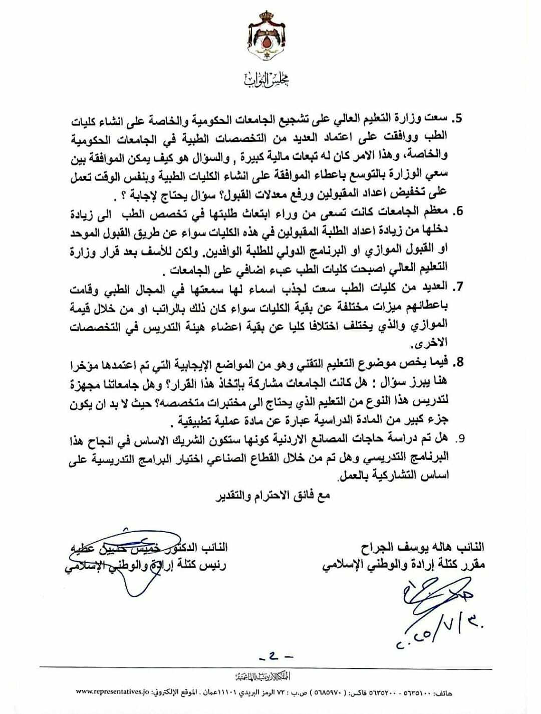 22 الاعلامي - طالبت كتلة إرادة والوطني الإسلامي النيابية من وزير التربية والتعليم توضيحات حول تخفيض أعداد المقبولين لكلية الطب في الجامعات الرسمية والخاصة في المملكة