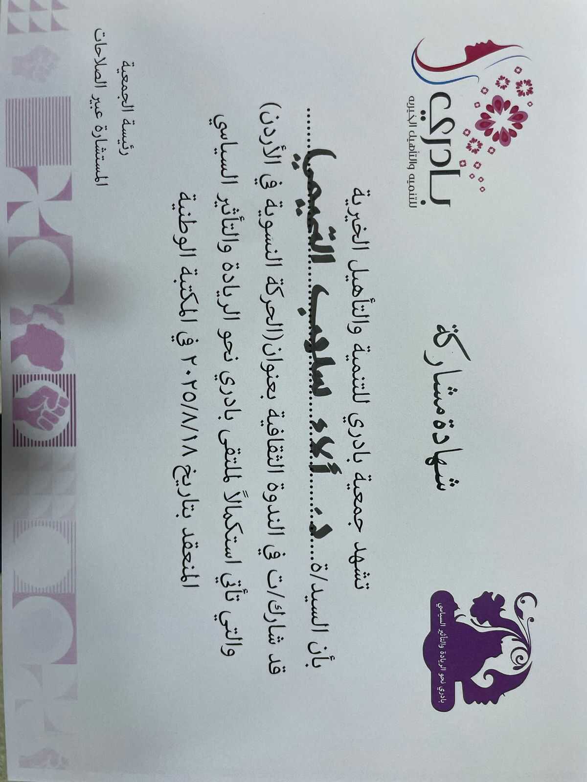 22 الاعلامي - شاركت رئيسة لجنة المرأة وشؤون الأسرة في الحزب الوطني الاسلامي الأعلامية آلاء سلهب التميمي، في الندوة الثقافية التي نظمتها جمعية بادر للتنمية والتأهيل الخيرية بعنوان: “الحركة النسوية في الأردن: نحو الريادة والتأثير السياسي”، والتي عُقدت في المكتبة الوطنية بتاريخ 18/8/2025 برئاسة الأستاذة عبير الصلاحات.