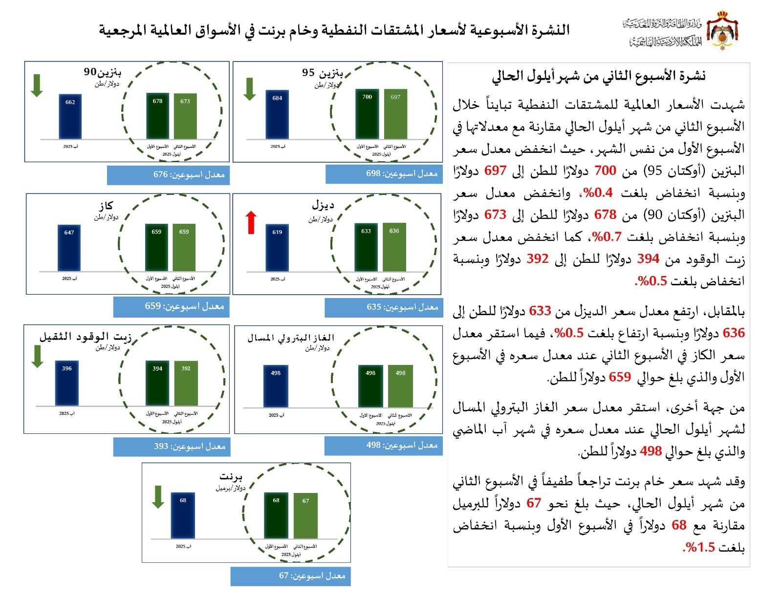 واستقر معدل سعر الغاز البترولي المسال لشهر أيلول عند معدل سعره في آب الماضي والبالغ 498 دولارا للطن، فيما انخفض معدل سعر خام برنت من 68 دولارا للبرميل الى67 دولار بنسبة 1.5 بالمئة.