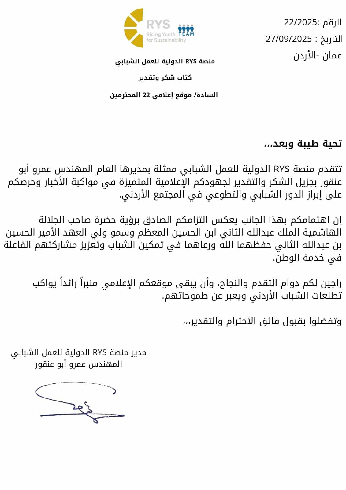 22 الاعلامي - تلقى موقع 22 الاعلامي كتاب شكر من منصة RYS الدولية للعمل الشبابي على الجهود التي يبذلها كادر الموقع في ابراز الدور الشبابي والتطوعي في المجتمع الاردني .