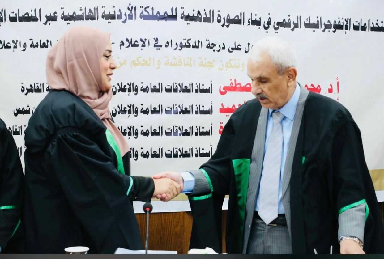 لا يسعني في هذه المناسبة إلا أن أهنئكِ بهذا التميز الكبير، والشكرا الموصول للأستاذ الدكتور محمود يوسف مشرفكِ الأكاديمي على دعمه وتوجيهه القيم، وكذلك الأستاذ الدكتور ثريا البدوي عميد كلية الإعلام على توجيهاته السديدة وإشرافه المتواصل.