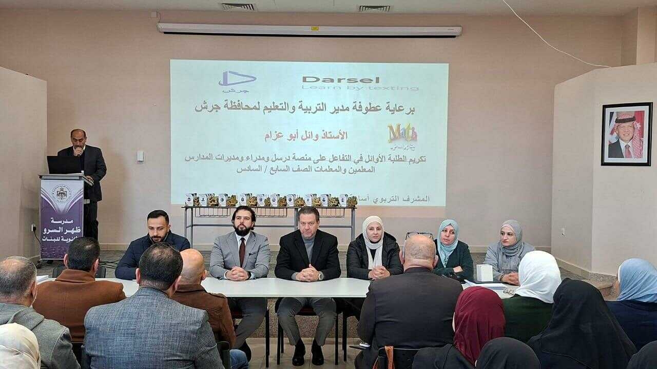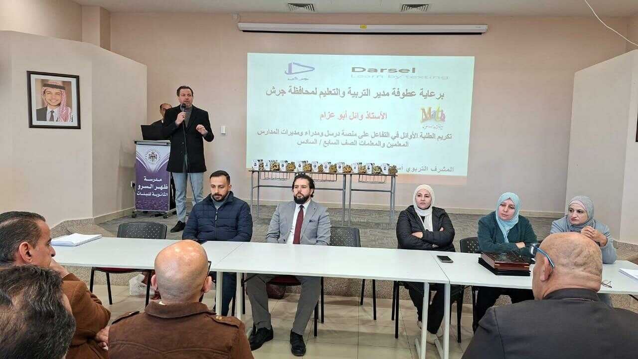 وجرى حفل التكريم على مسرح مدرسة ظهر السرو الثانوية للبنات، بحضور مديرة الشؤون التعليمية نسرين عتوم، ورئيس قسم الإشراف التربوي الدكتورة نجود الفريحات، ومدير منصة “درسل” في الأردن الأستاذ محمد كنعان، وعدد من المشرفين التربويين والمعنيين بالمبادرة.