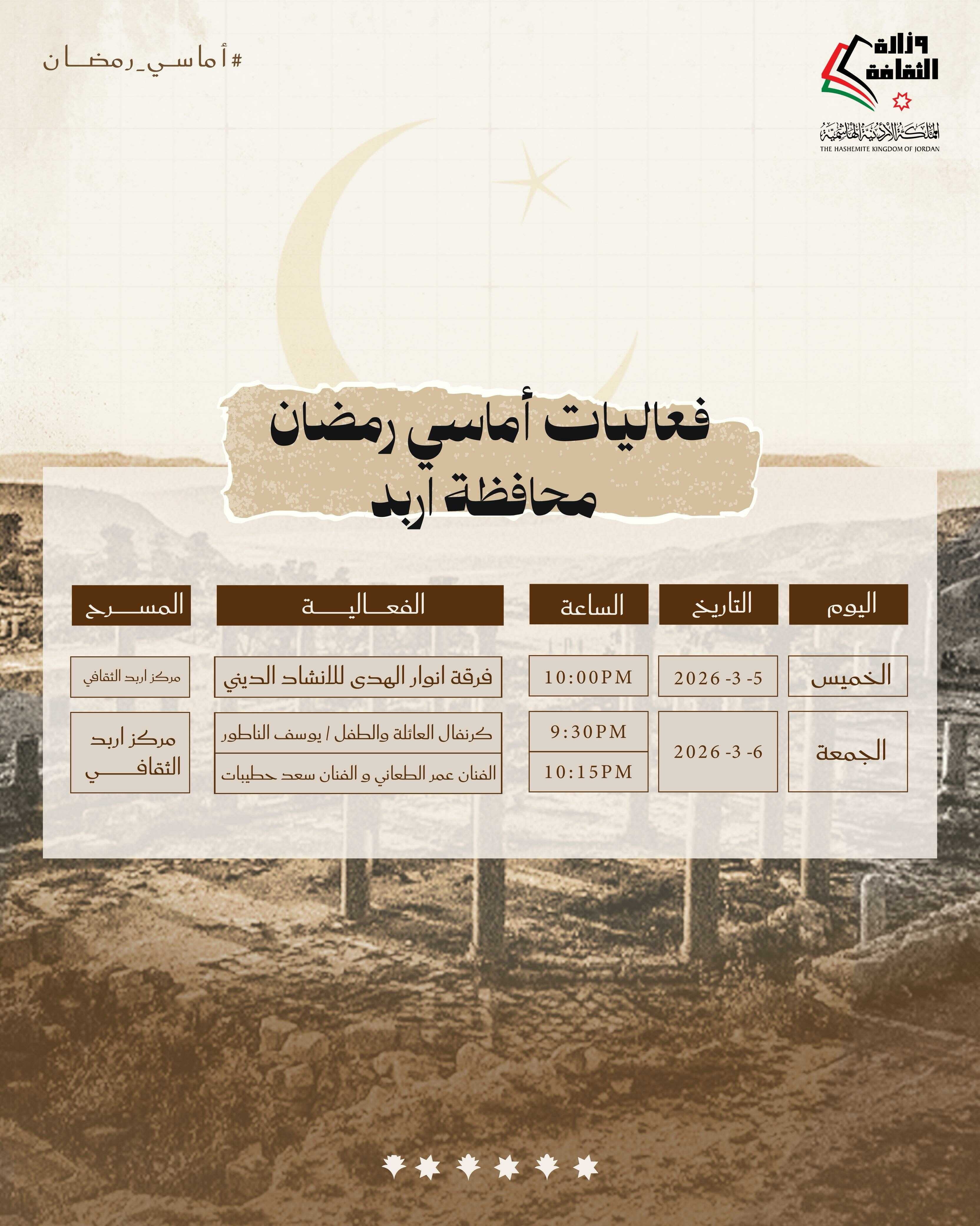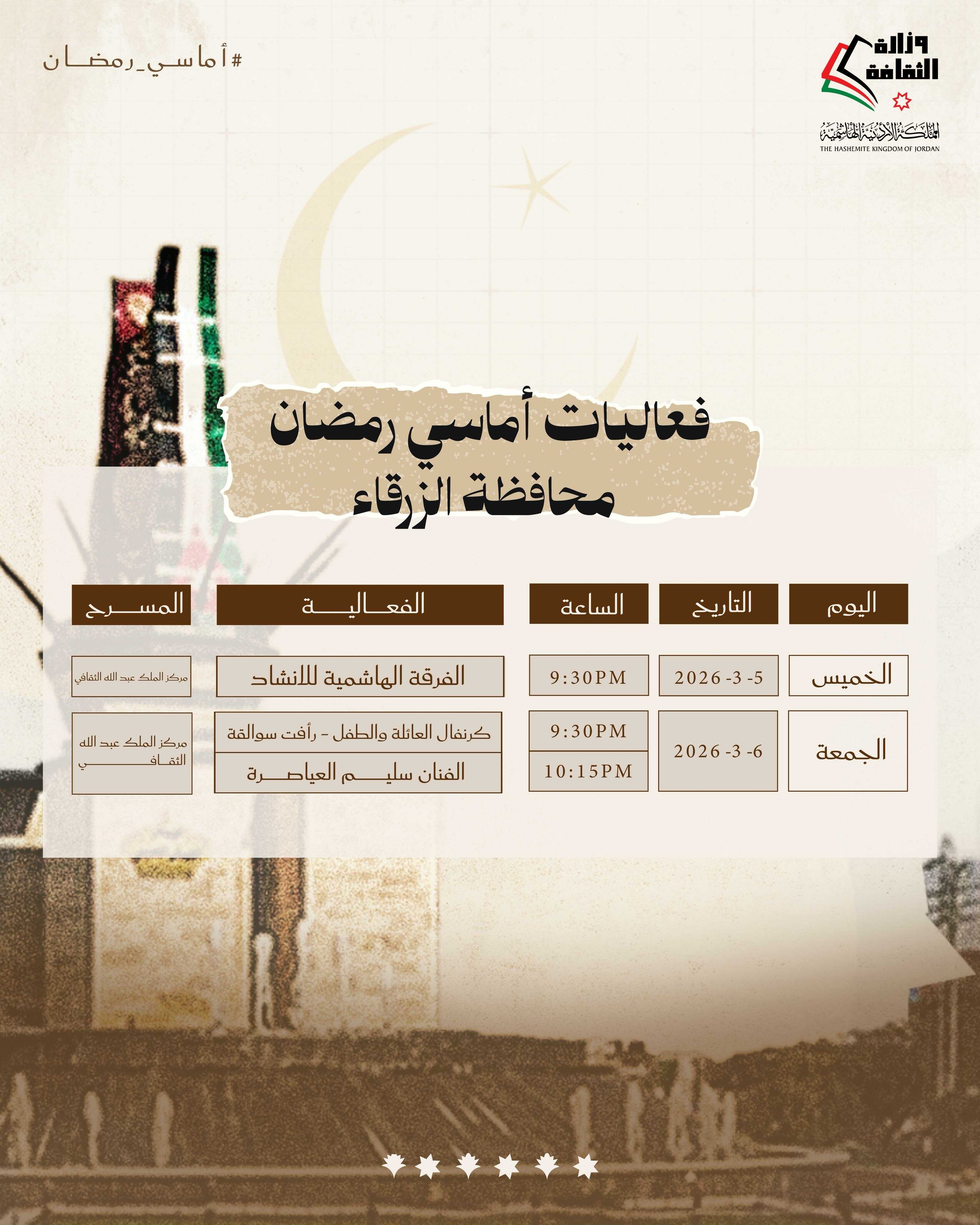 ويتضمن البرنامج فعاليات متنوعة تراعي التعدد الثقافي وتعمل على ترسيخ القيم الإيجابية خلال أيام الشهر الفضيل، كما يشتمل البرنامج على فقرات ترفيهية مخصصة للأطفال ومناسبة للعائلة الأردنية، بما يعكس القيم السمحة لرمضان، مؤكدًا أن الحراك الثقافي يشكل جزءًا أصيلًا من المشهد الرمضاني في المملكة.