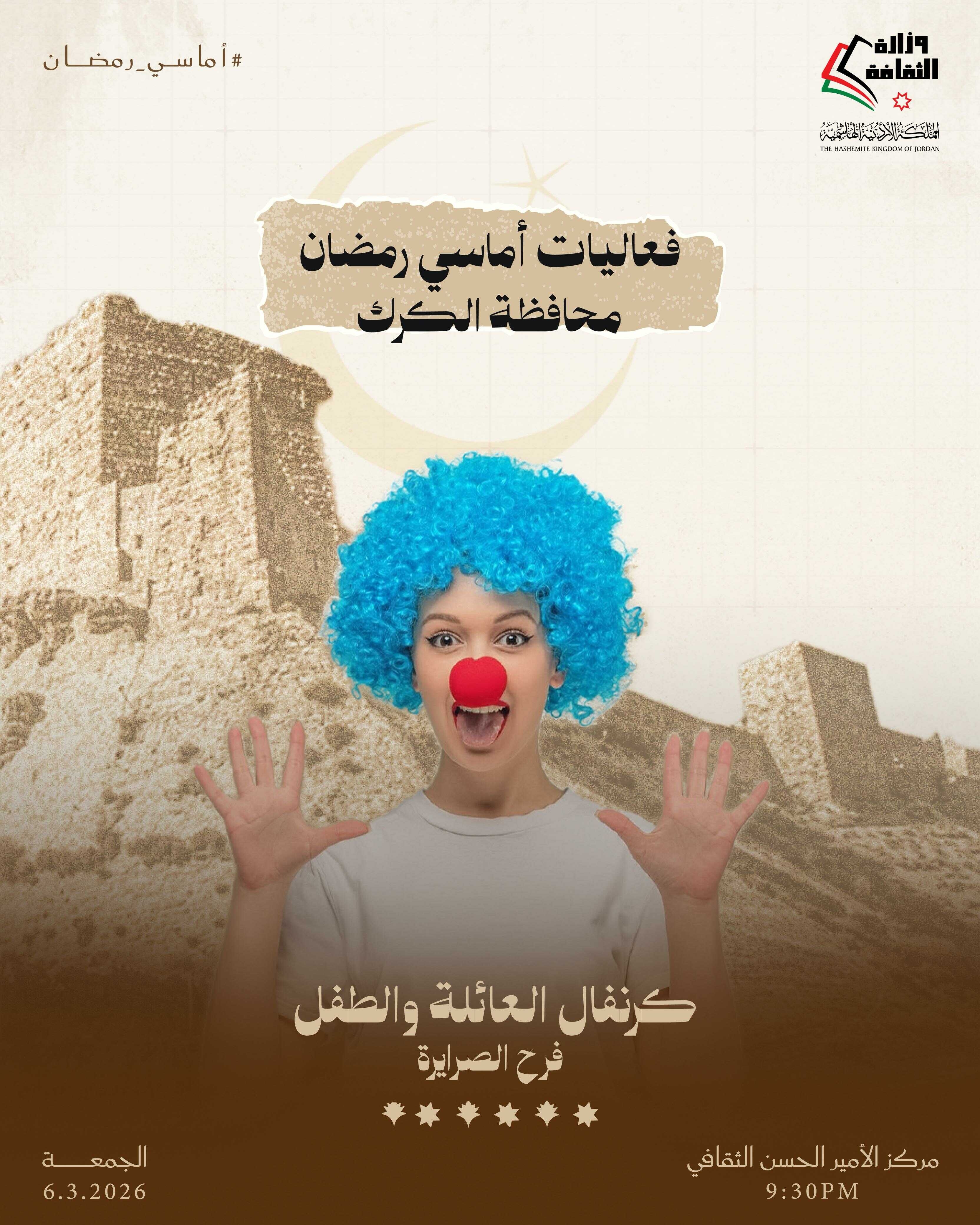 في محافظة الكرك، يستضيف مركز الأمير الحسن الثقافي، يوم الخميس، الساعة العاشرة مساءً، حفلًا إنشاديًا تحييه فرقة «أنوار الشام» من سوريا. ويقام في المركز نفسه، يوم الجمعة، الساعة التاسعة والنصف مساءً، كرنفال للعائلة والطفل، يقدمه الفنانة فرح الصرايرة، فيما يقدم الفنان فادي رأفت أمسية فنيّة، الساعة العاشرة والربع مساءً.