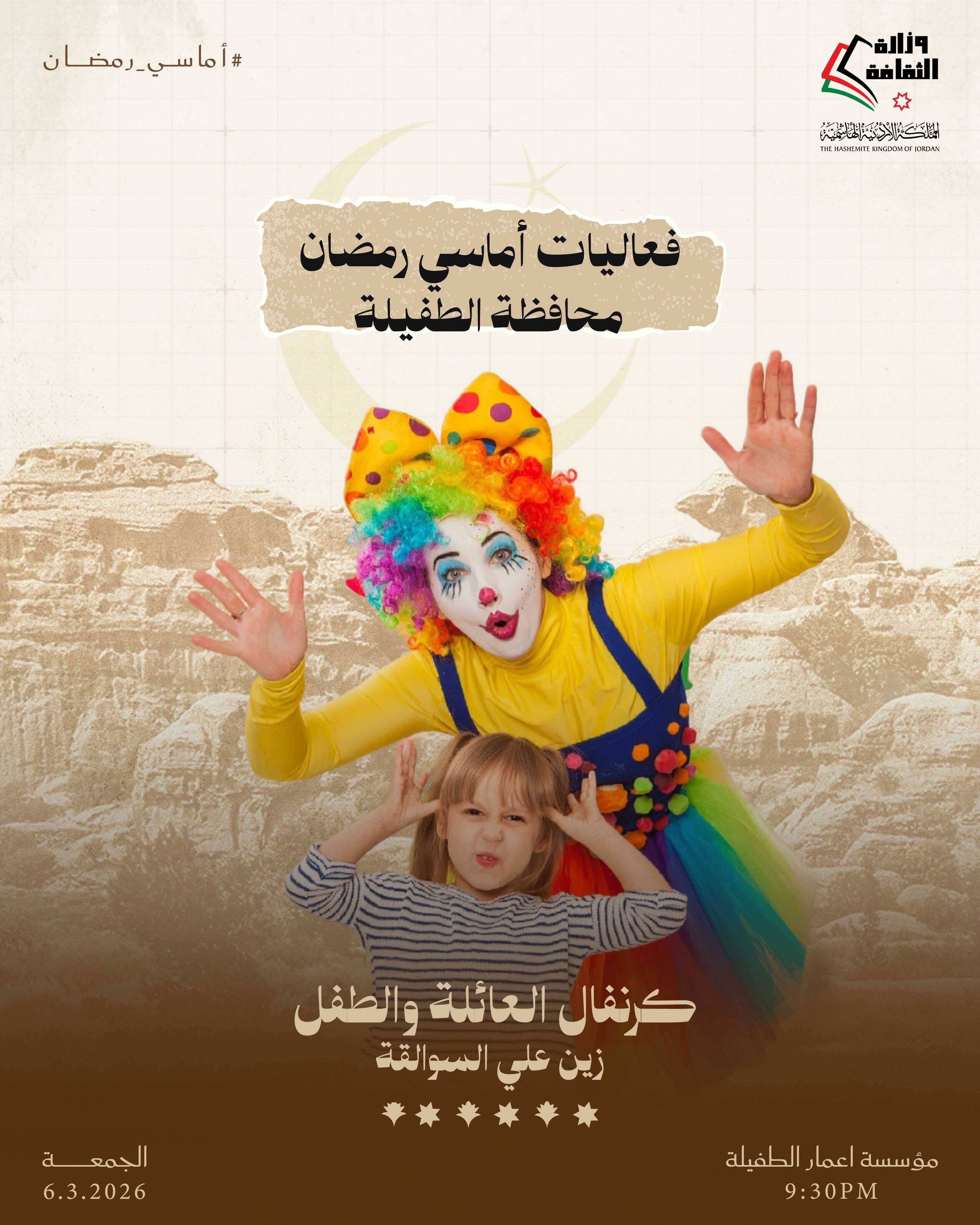 في محافظة الطفيلة، يقدم في مؤسسة إعمار الطفيلة، كرنفال للعائلة والطفل للفنان فرح الصرايرة، الساعة التاسعة والنصف مساءً، فيما يقدم الفنان علي حمادة أمسية فنيّة الساعة العاشرة والربع مساءً. ويوم الجمعة يقدم الفنان زين علي السوالقة كرنفالا للعائلة والطفل، في المؤسسة نفسها، الساعة التاسعة والنصف مساءً، فيما يقدم المنشد صالح الخلايلة أمسية فنيّة الساعة العاشرة والربع مساءً.
