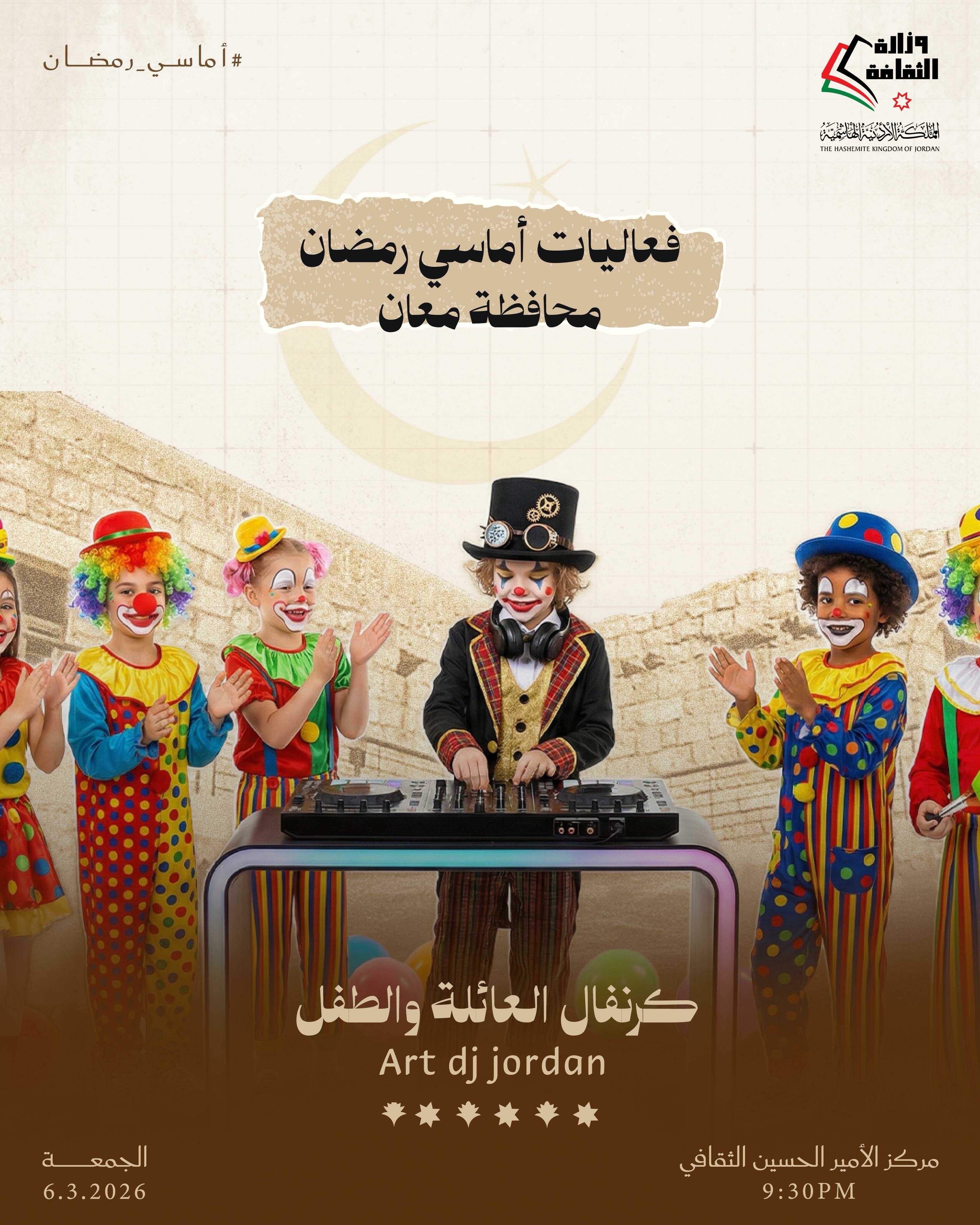 في محافظة معان، تقام في مركز الأمير الحسين بن عبد الله الثاني الثقافي، يوم الخميس، الساعة التاسعة والنصف مساءً، أمسية فنية للمنشد مجاهد الخوالدة. ويقام يوم الجمعة، في المركز نفسه، الساعة التاسعة والنصف مساءً، كرنفال للعائلة والطف تقدمه فرقة Art dj Jordan وتقدم فرقة تراث معان أمسية فنيّة الساعة العاشرة والربع مساءً.