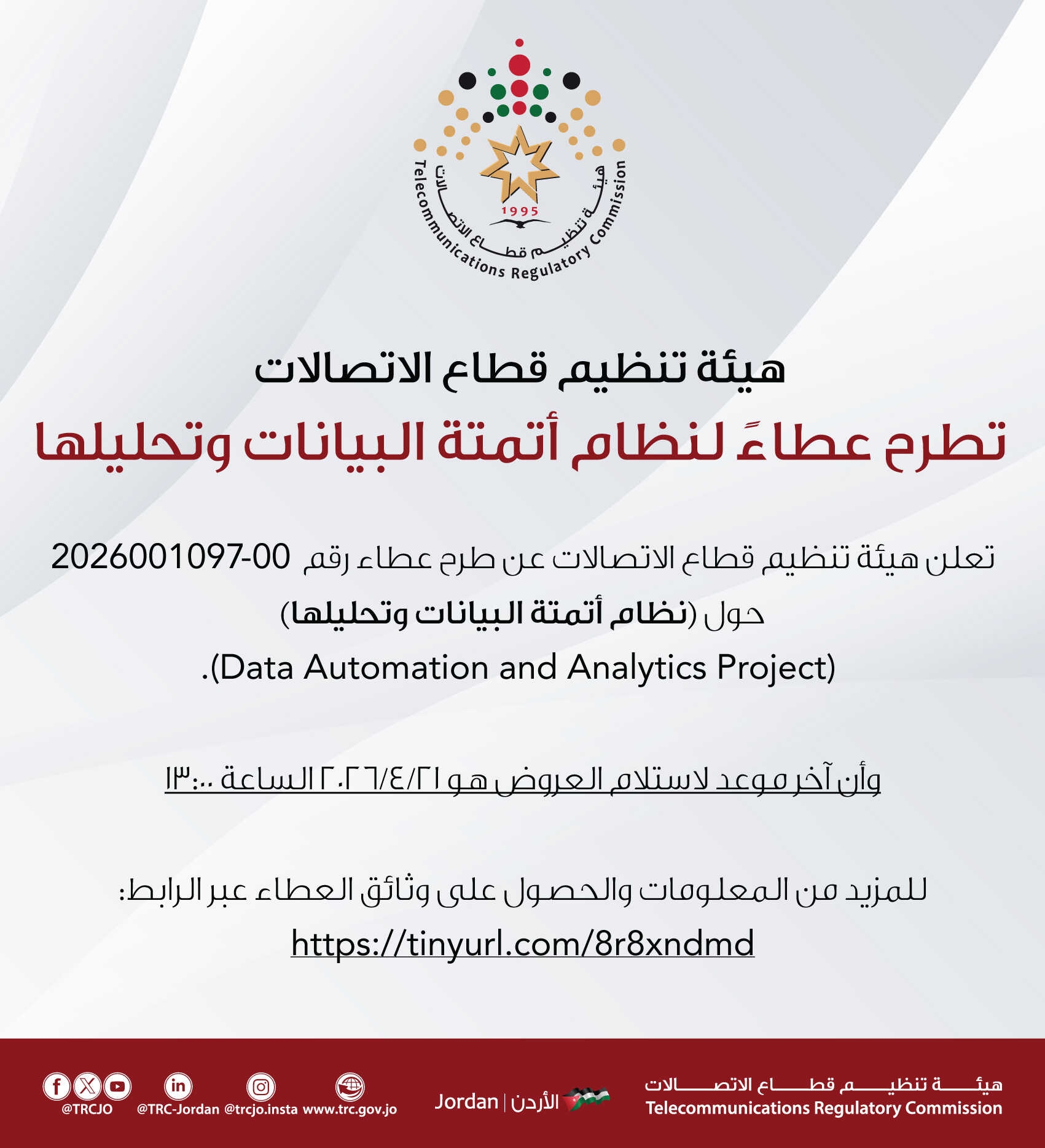 تعلن هيئة تنظيم قطاع الاتصالات عن طرح عطاء رقم 00-2026001097 حول (نظام أتمتة البيانات وتحليلها) (Data Automation and Analytics Project).