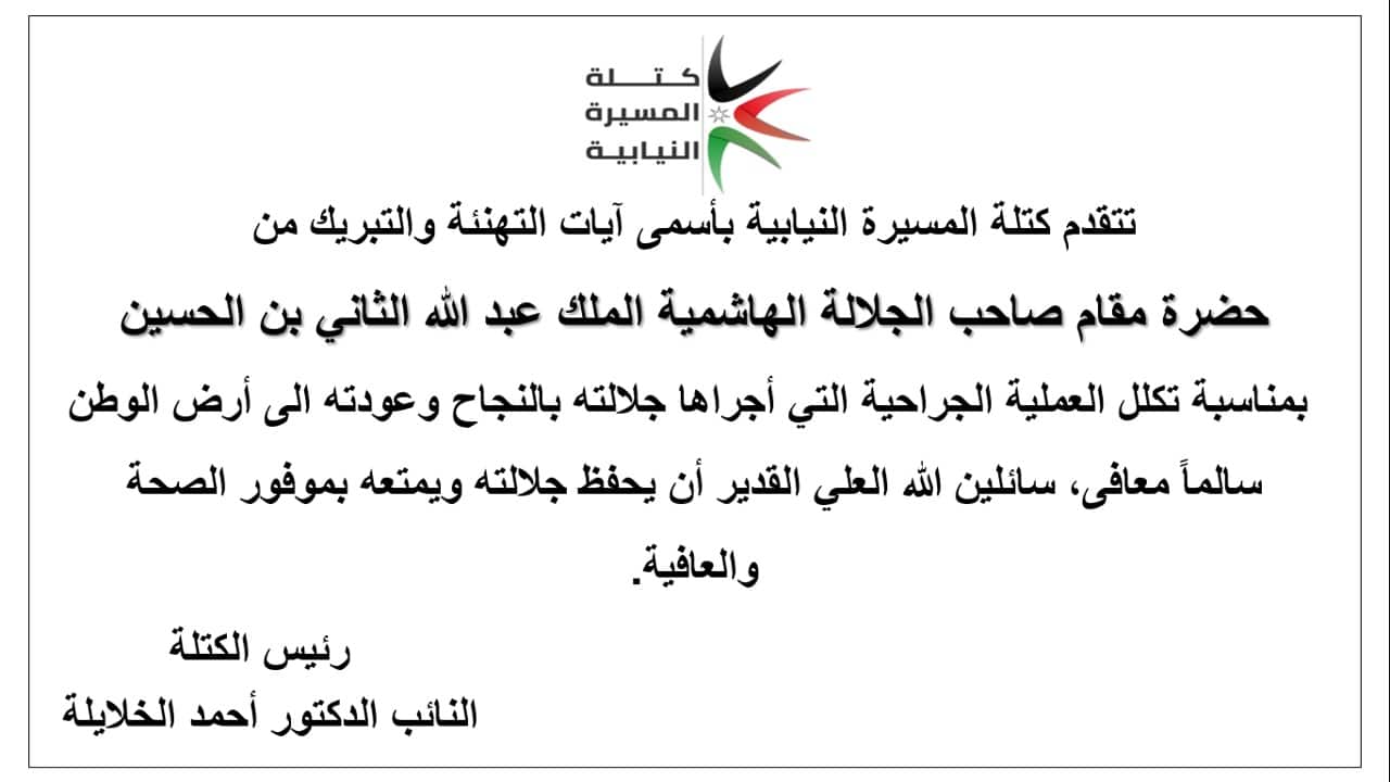 تتقدم كتلة المسيرة النيابية بأسمى آيات التهنئة والتبريك من حضرة مقام صاحب الجلالة الهاشمية الملك عبد الله الثاني بن الحسين