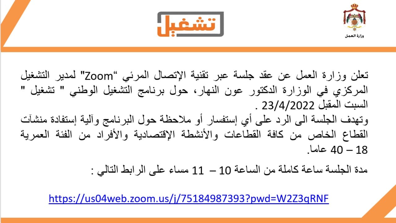 تعلن وزارة العمل أن مدير مديرية التشغيل المركزي الدكتور عون النهار يعقد جلسة عبر تقنية الاتصال المرئي "zoom"، للرد على أي استفسار أو ملاحظة حول برنامج التشغيل الوطني “تشغيل" وآلية استفادة منشآت القطاع الخاص من كافة القطاعات والأنشطة الاقتصادية والأفراد من الفئة العمرية من 18 – 40 سنة.