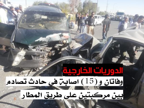 وقالت الدوريات الخارجية إنها تعاملت مع حادث تصادم بين مركبتين على طريق الخدمات الواقع قبل جسر المطار بحوالي 200 متر باتجاه الجنوب نتج عنه وفاة شخصين واصابة 15 حالاتهم الصحية بين الخفيفة والمتوسطة وتم نقلهم إلى المستشفى.