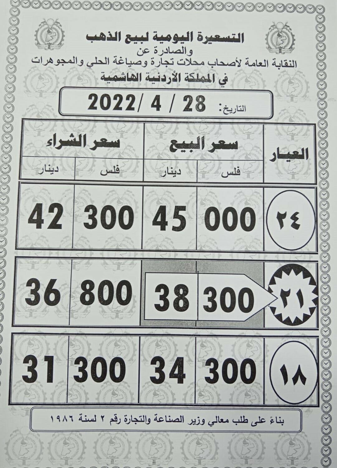 22 الإعلامي – أصدرت النقابة العامة لأصحاب محلات تجارة و صياغة الحلي والمجوهرات تسعيرة الذهب المحلي لـيوم الخميس الموافق 28/4/2022 في المملكة الأردنية الهاشمية .