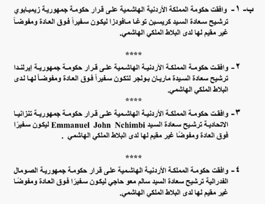 ووافقت على قرار حكومة جمهورية تنزانيا الاتحادية ترشيح ايمانويل جون ليكون سفيرا لبلاده لدى البلاط الملكي الهاشمي.