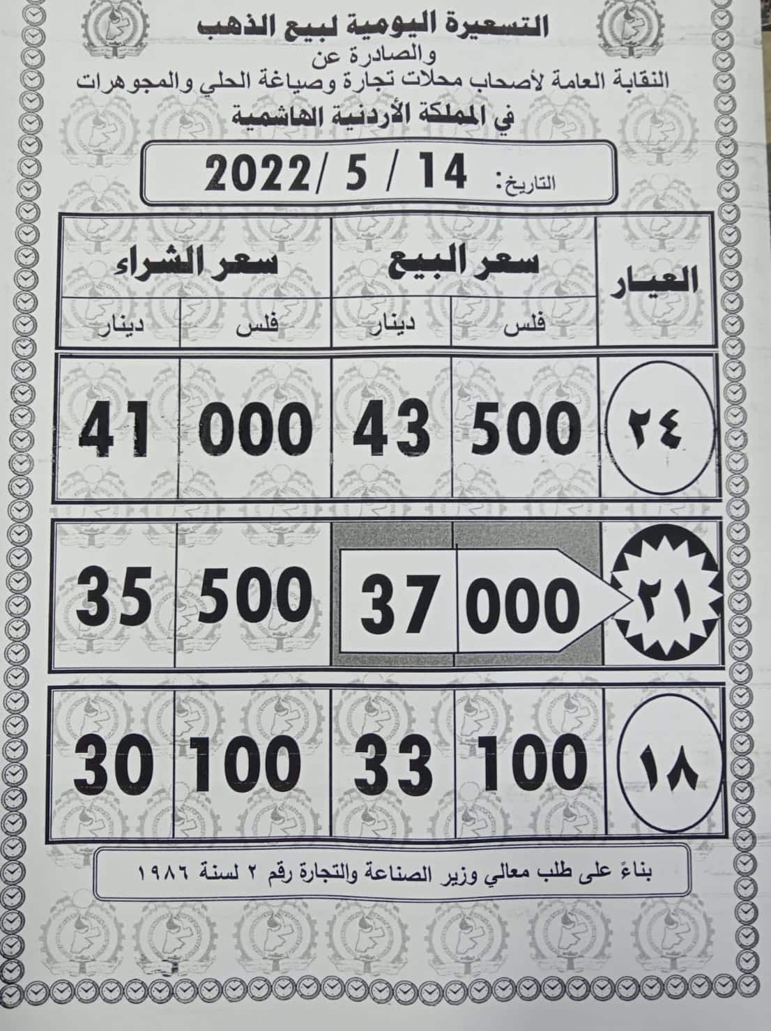 22 الإعلامي- أصدرت النقابة العامة لأصحاب محلات تجارة و صياغة الحلي والمجوهرات تسعيرة الذهب المحلي لـيوم السبت الموافق 14/5/2022 في المملكة الأردنية الهاشمية .