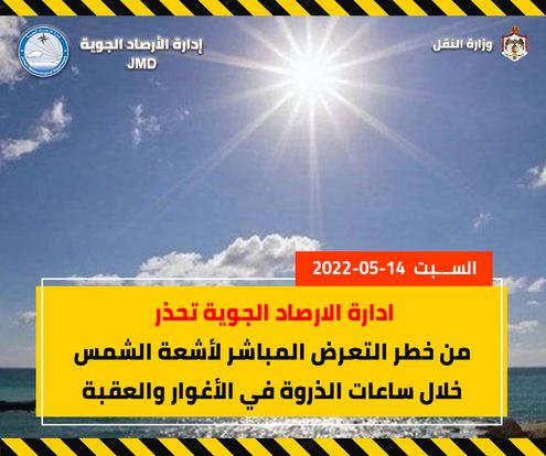 وحذرت دائرة الأرصاد الجوية من خطر التعرض المباشر لأشعة الشمس خلال ساعات الذروة في مناطق الأغوار والعقبة.