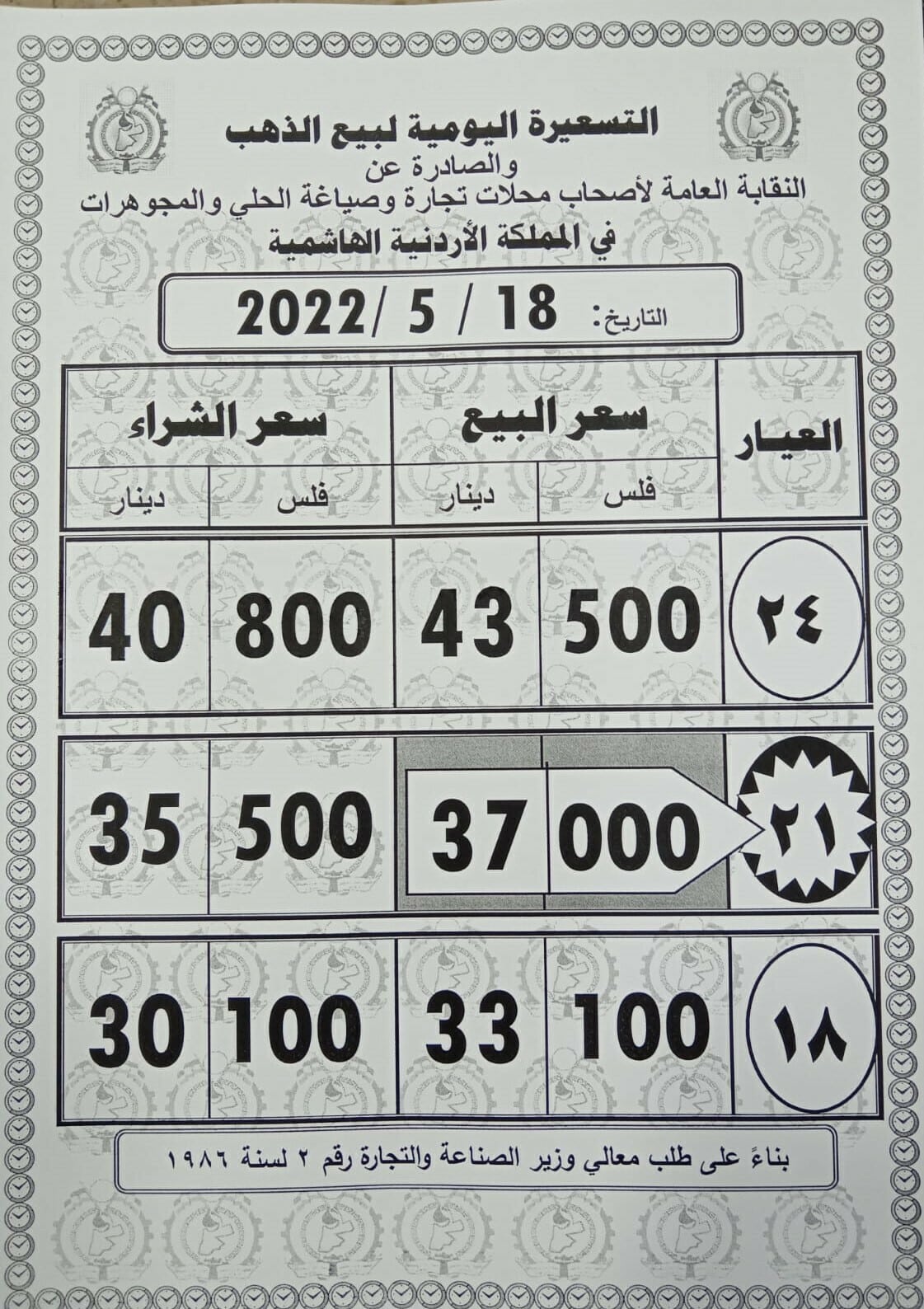 22 الإعلامي - أصدرت النقابة العامة لأصحاب محلات تجارة و صياغة الحلي والمجوهرات تسعيرة الذهب المحلي لـيوم الأربعاء الموافق 18/5/2022 في المملكة الأردنية الهاشمية .
