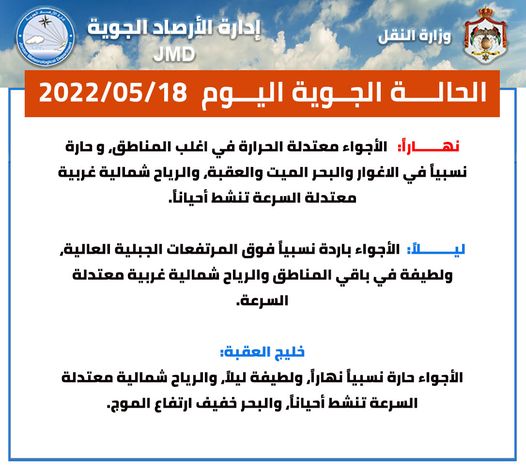22 الإعلامي - نشرت دائرة الأرصاد الجوية عبر موقعها حالة الطقس المتوقعة لـيوم الأربعاء 18/5/2022.