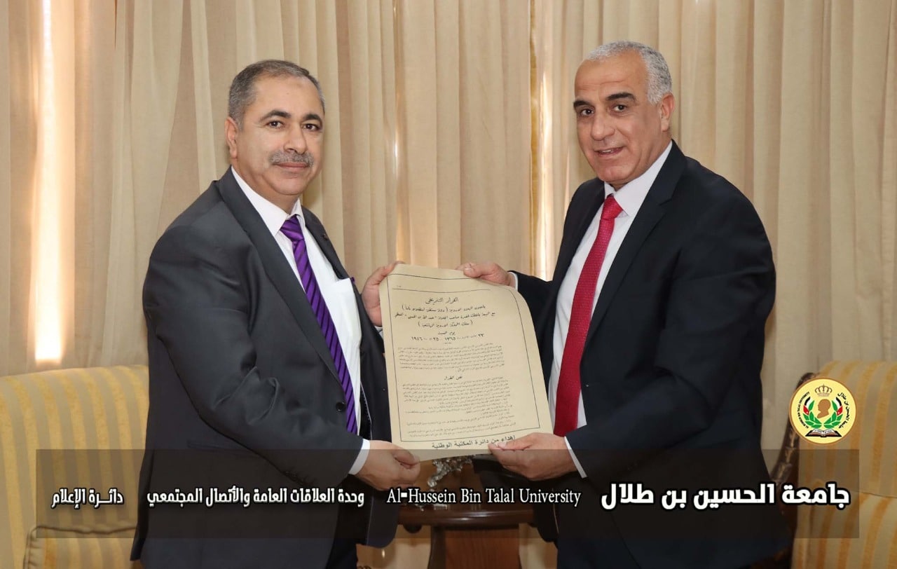 كما وشكر الخرابشة المكتبة الوطنية على الدور الهام الذي تقوم به في الحفاظ على الإرث التاريخي الوطني وجمعه وتوثيقه وحفظه ، وفي الختام قدم رئيس الجامعة درعاً تكريميا لمدير المكتبة الوطنية ،كما وسلم مدير عام المكتبة الوطنية لرئيس الجامعة ألبوماً يتضمن وثائق الاستقلال تكريماً له وتقديرا لجهوده في نشر الوعي الوطني بين الطلبة، كما وسلم الخرابشة وثائق استقلال المملكة إلى عدد من الحضور .