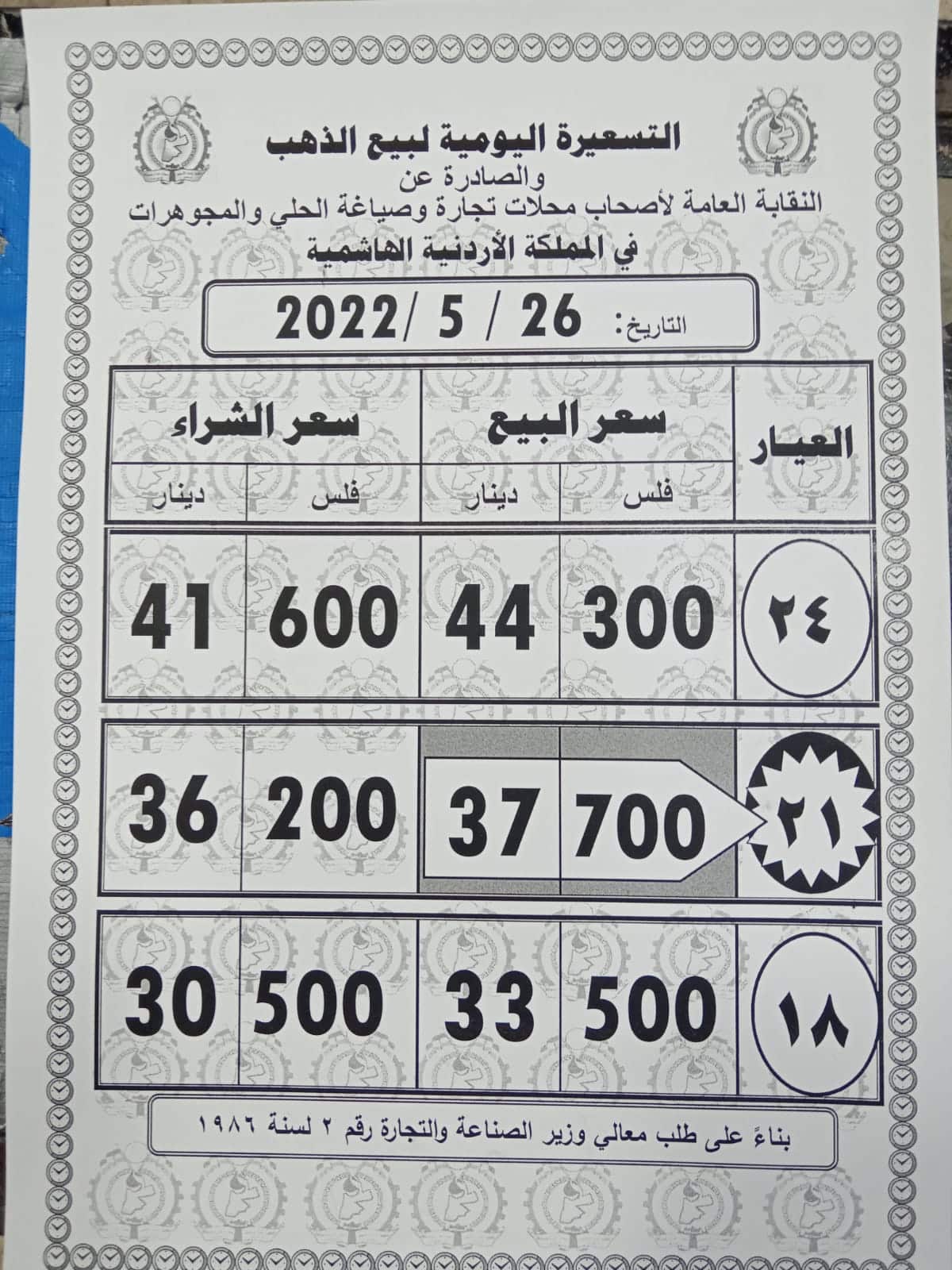 22 الإعلامي -أصدرت النقابة العامة لأصحاب محلات تجارة و صياغة الحلي والمجوهرات تسعيرة الذهب المحلي لـيوم الخميس الموافق 26/5/2022 في المملكة الأردنية الهاشمية .