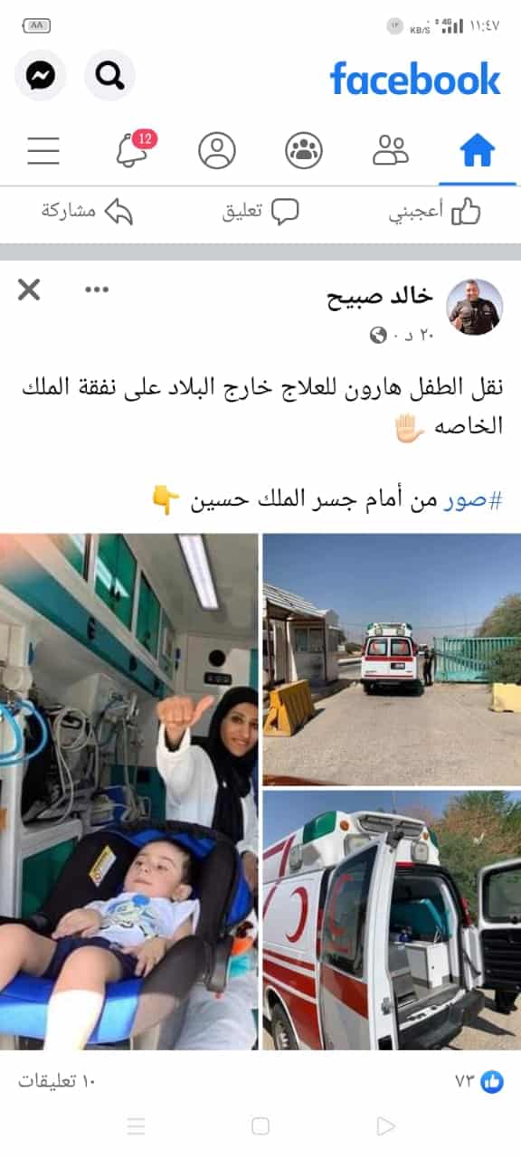 وثمنت أسرة الطفل هارون دور جلالة الملك عبد الله الثاني لمتابعته حالة الطفل هارون والايعاز لعلاجه وهذا إن دل يدل على أن جلالته أباً لجميع الأردنيين.