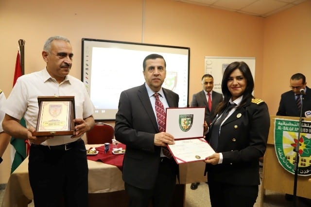 وقام رئيس الجامعة الدكتور العجلوني بتكريم الكابتن حنان ابو عثمان اول خريجة أردنية من مركز العقبة للتعليم والتدريب البحري متمنيا لها التوفيق في حياتها العملية.
