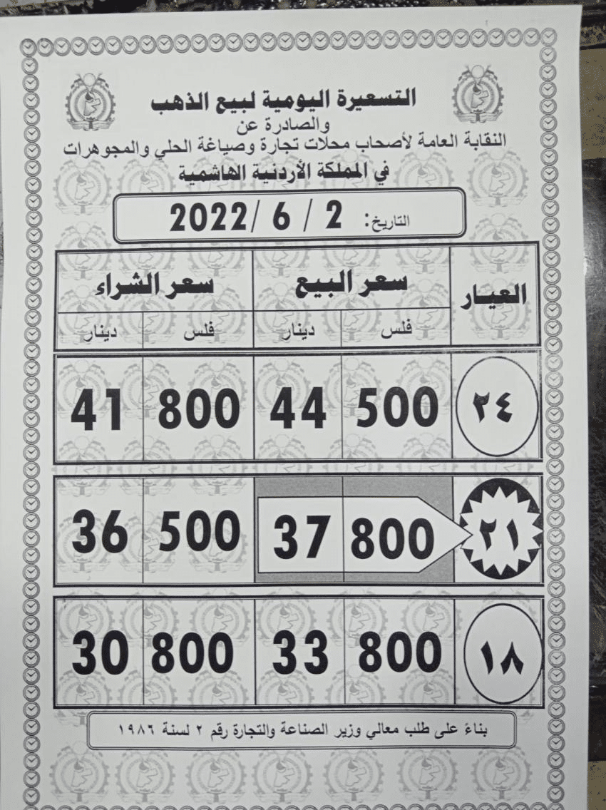وارتفع سعر بيع غرام الذهب عيار 21 الأكثر طلبا في السوق المحلية بمقدار 40 قرشا ليصل إلى 37،80 ديناراً، لغايات شراء المواطنين من محلات الصاغة، مقابل 36،30 دينارا لجهة البيع.
