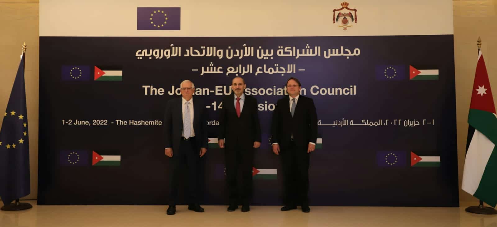 22 الإعلامي- البحر الميت 2 حزيران- ترأس نائب رئيس الوزراء ووزير الخارجية وشؤون المغتربين أيمن الصفدي ونائب رئيس المفوضية/ الممثل الأعلى للشؤون الخارجية والسياسة الأمنية في الاتحاد الأوروبي جوزيب بوريل الاجتماع الرابع عشر لمجلس الشراكة بين المملكة والاتحاد الأوروبي، اليوم الخميس، في منطقة البحر الميت، وبمشاركة المفوض الأوروبي لسياسة الجوار والتوسع أوليفر فارهيلي ووزراء خارجية كل من قبرص ولوكسمبورغ واليونان وإيرلندا وعدد كبير من مسؤولي دول الاتحاد الأوروبي.