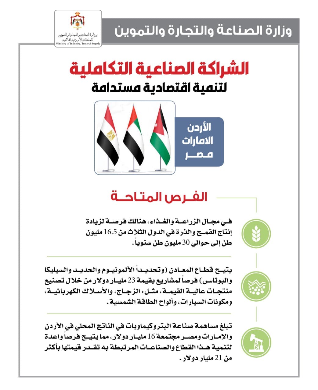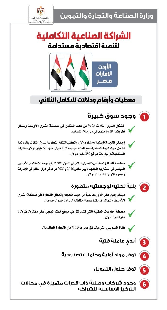 وقال : يبلغ إجمالي التجارة بين الدول الثلاث 6 مليار دولار وتحظى الكتلة التجارية للدول الثلاث بالمرتبة 14 من حيث قيمة الصادرات مع العالم بقيمة 419 مليار منها 55 مليار دولار الصادرات الصناعية والواردات بواقع 380 مليار دولار وتبلغ مساهمة القطاع الصناعي 85 مليار دولار في الدول الثلاث وبلغت قيمة الاستثمار الأجنبي المباشر في المشاريع الجديدة بين عامي 2016 و 2020 من باقي دول العالم في الإمارات ومصر والأردن 148مليار دولار.