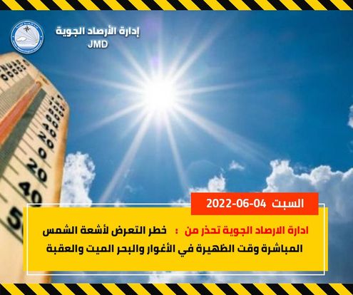 22 الإعلامي - نشرت دائرة الأرصاد الجوية الأردنية حالة الطقس المتوقعة ليوم السبت 4/6/2022 نهــــــــاراً: تسجل درجات الحرارة العظمى أعلى من معدلاتها العامة بقليل، الأجواء معتدلة الحرارة في المرتفعات الجبلية والسهول، وحارة في باقي مناطق المملكة، مع ظهور بعض الغيوم العالية، والرياح شمالية غربية معتدلة السرعة تنشط على فترات.