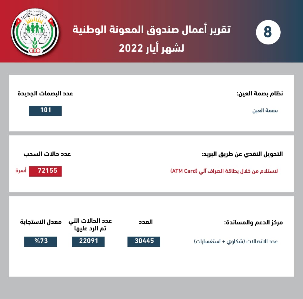 ووفقا لتقرير أعمال صندوق المعونة الوطنية لشهر أيار الماضي، بلغ عدد الأسر الجديدة المستفيدة من المعونة الشهرية المتكررة 19 أسرة، واستفادت 743 أسرة جديدة من برنامج المعونات المالية الطارئة العاجلة والفورية، و51 أسرة جديدة من برنامج التأهيل الجسماني، و57 شخصا استفادوا من برنامج دعم برامج التدريب المهني لأبناء الأسر المنتفعة.