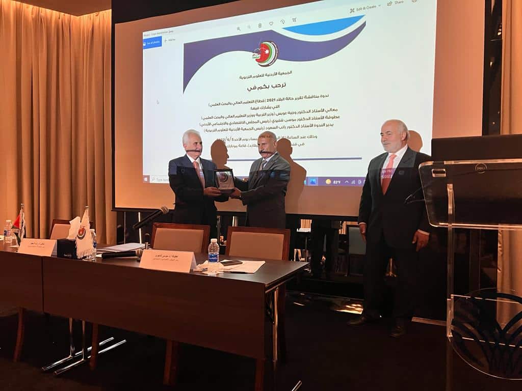 أقامت الجمعية الأردنية للعلوم التربوية ندوة حوارية لمناقشة تقرير حالة البلاد 2021 (قطاع التعليم العالي والبحث العلمي)، والتي تحدث فيها الدكتور وجيه عويس وزير التربية والتعليم العالي والبحث العلمي، والدكتور موسى شتيوي رئيس المجلس الاقتصادي والاجتماعي، وادارها الدكتور راتب السعود رئيس الجمعية الأردنية للعلوم التربوية، مساء الأحد في فندق روتانا عمان (العبدلي)، وبمشاركة رؤساء الجامعات الأردنية، وأعضاء مجلس التعليم العالي، والقيادات الأكاديمية في مؤسسات التعليم العالي الأردنية، وأعضاء الجمعية.