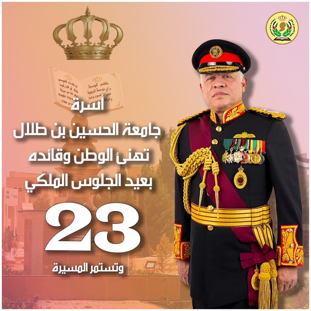 يتقدم رئيس جامعة الحسين بن طلال الأستاذ الدكتور عاطف الخرابشة باسمه واسم أسرة الجامعة، من مقام حضرة صاحب الجلالة الهاشمية الملك عبدالله الثاني ابن الحسين المعظم وولي عهده الأمين سمو الأمير الحسين بن عبدالله الثاني، بخالص التهنئة والتبريك بمناسبة عيد الجلوس الملكي الثالث والعشرين، وذكرى الثورة العربية الكبرى، ويوم الجيش.