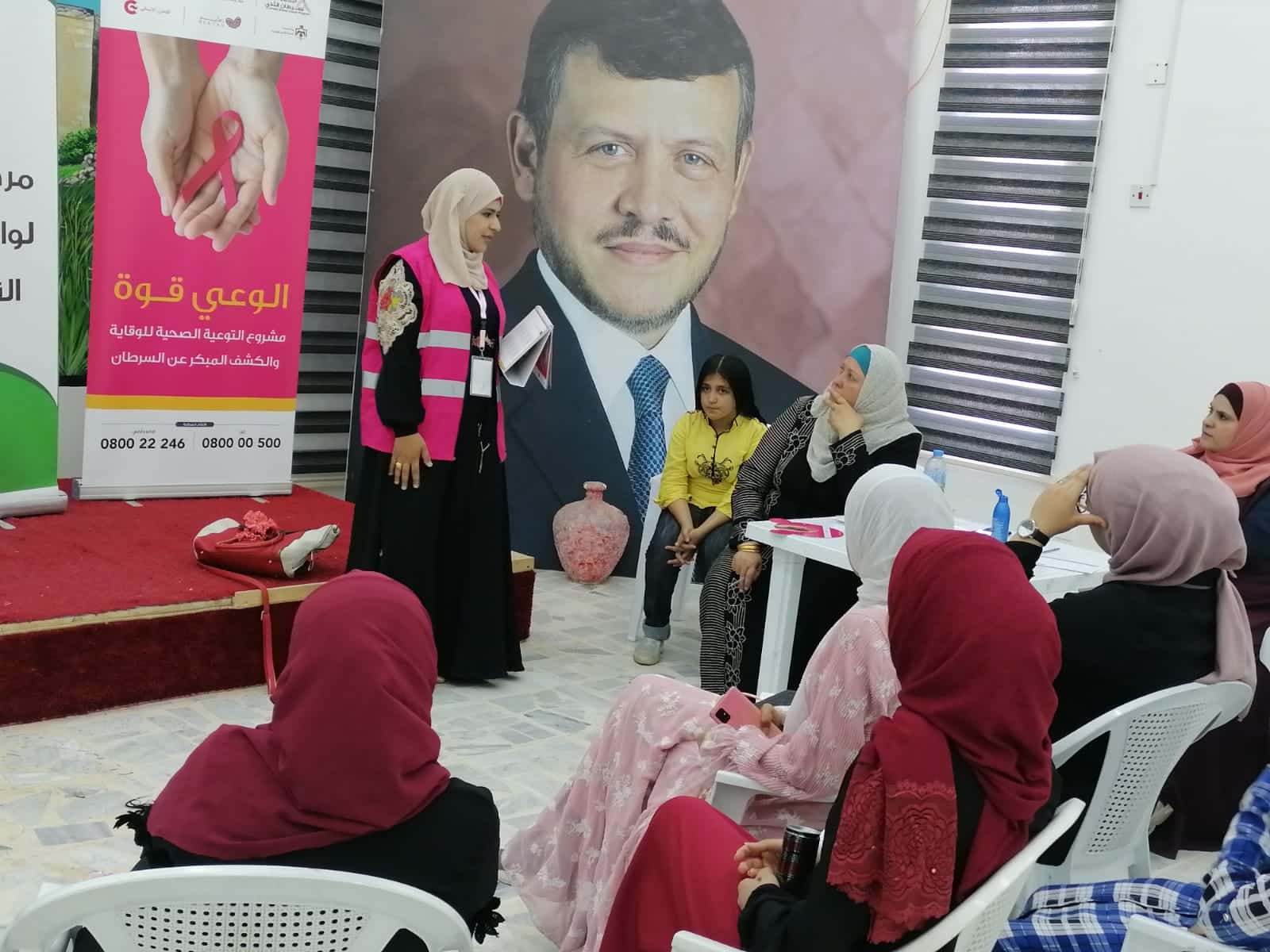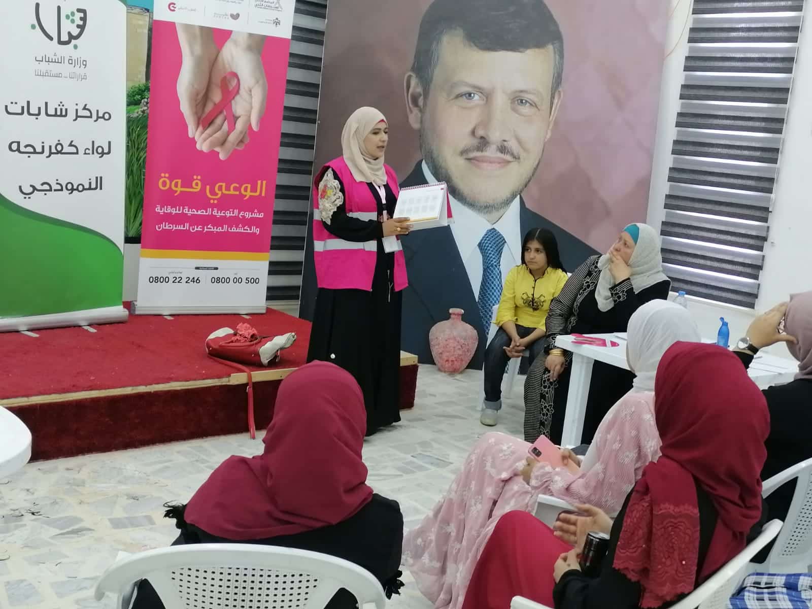 نفذ مركزي شابات كفرنجة النموذجي وشابات الهاشمية ورشة عمل توعوية صحية بعنوان" سرطان الثدي وعنق الرحم" بالتعاون مع البرنامج الاردني لسرطان الثدي_مركز الحسين للسرطان،بتدريب كل من اسلام المومني و آيه ربابعه بمشاركة 15 شابة في كل مركز ضمن الفئة العمرية 15_25 عاما