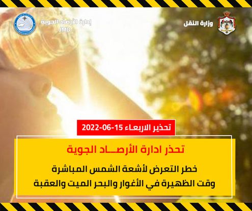 وحذرت دائرة الأرصاد الجوية من خطر التعرض لأشعة الشمس المباشرة وقت الظهيرة في الأغوار والبحر الميت والعقبة.