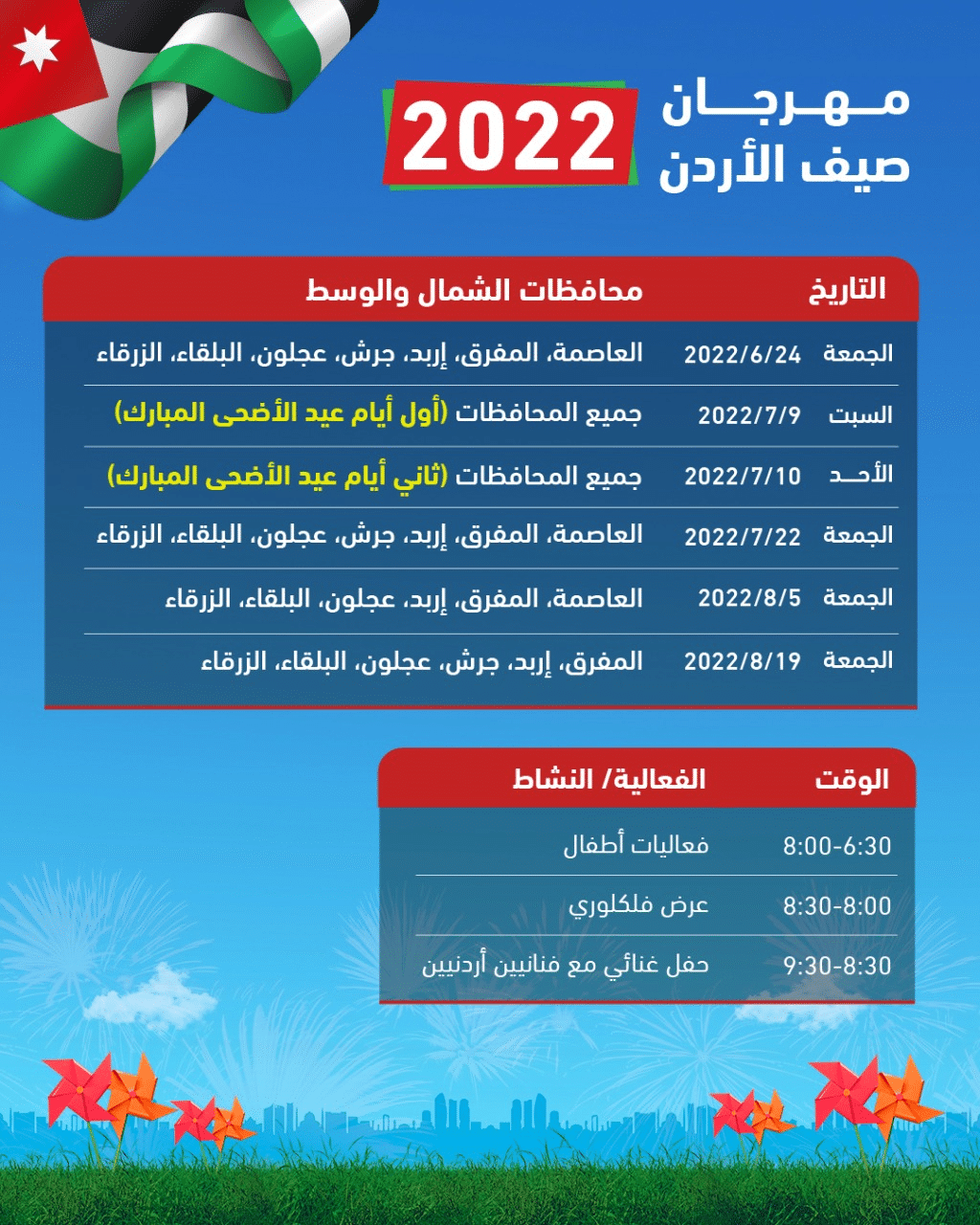 وتهدف هذه الفعاليات إلى توفير أجواء من البهجة والفرح للمواطنين، ومنحِ الأطفال وأسرهم أجواء احتفالية وترفيهيَّة، بالتَّزامن مع بدء العطلة الصيفية لطلبة المدارس والجامعات، وعودة المغتربين الأردنيين لقضاء إجازة الصَّيف، وحلول عيد الأضحى المبارك. .