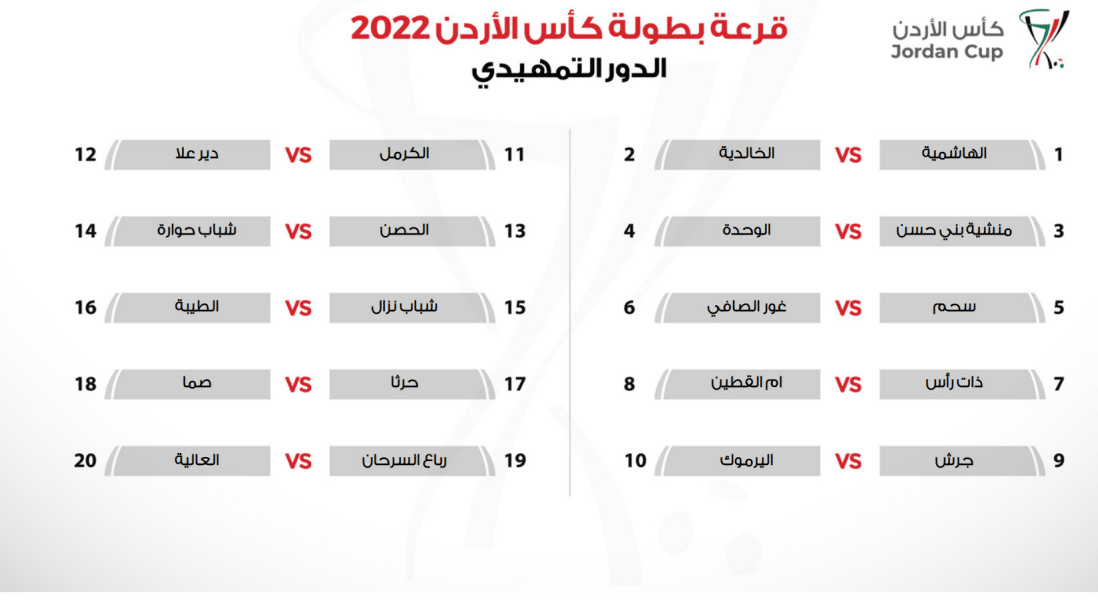 كما سحبت اليوم في مقر الاتحاد، قرعة الدور التمهيدي لبطولة كأس الأردن الذي يقام بمشاركة 20 فريقا هي أندية الدرجة الثانية (16 فريقا) وفريقا الهاشمية والعالية الصاعدان إلى دوري الدرجة الأولى الموسم الماضي، بالإضافة إلى اليرموك والكرمل صاحبا الترتيب الحادي عشر والثاني عشر من دوري الدرجة الأولى للموسم الماضي.