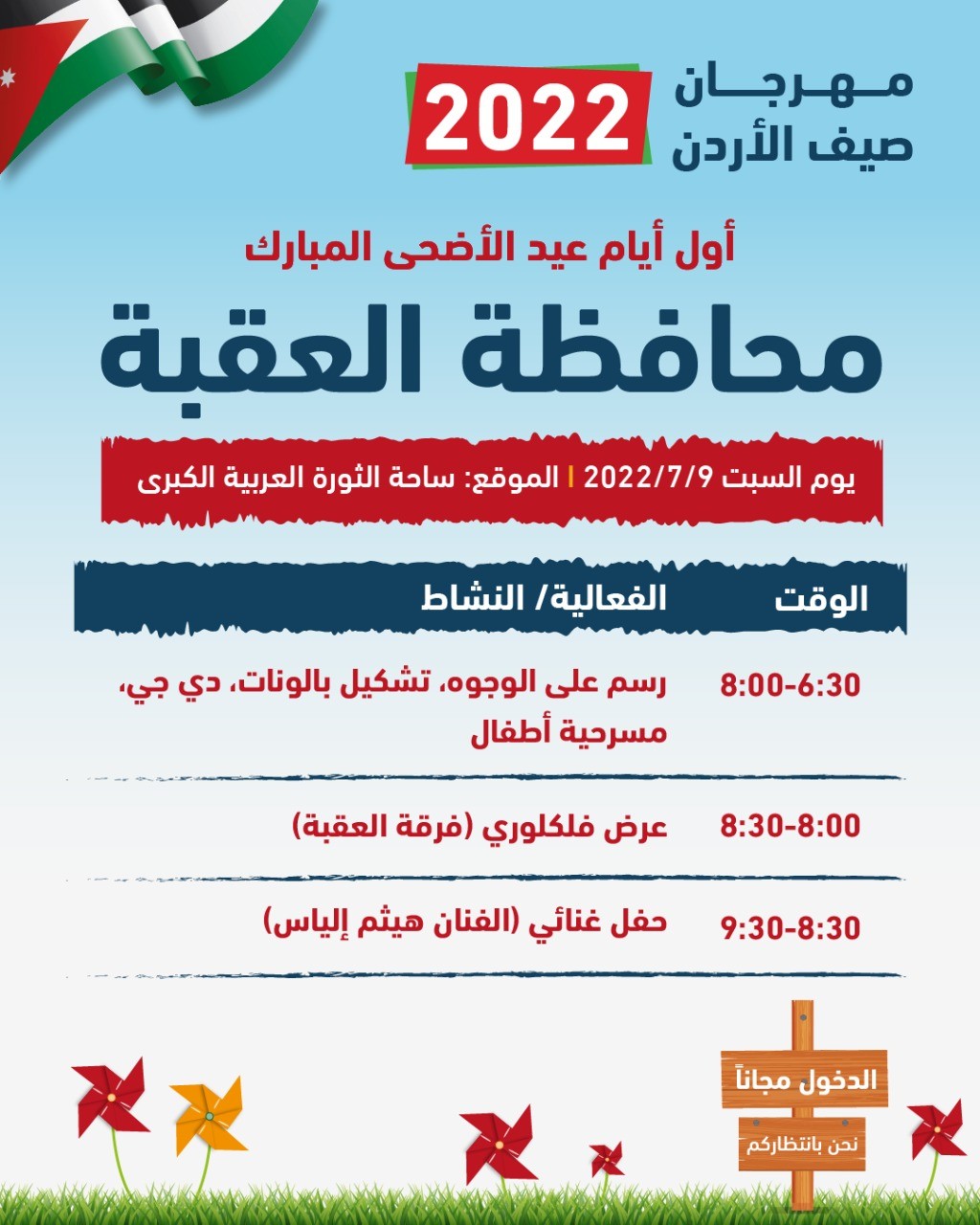وبينت الوزارة أن فعاليات مهرجان "صيف الأردن 2022"، ستبقى مستمرة حتى 26 آب المقبل في جميع محافظات المملكة، حيث تبدأ فعاليات المهرجان الصيفي في أيام الجمع من الساعة السادسة والنصف مساء وحتى العاشرة ليلاً، ضمن المواقع المخصصة التي جرى تحديدها مسبقاً لإقامة الأنشطة المتنوعة في كل محافظة.
